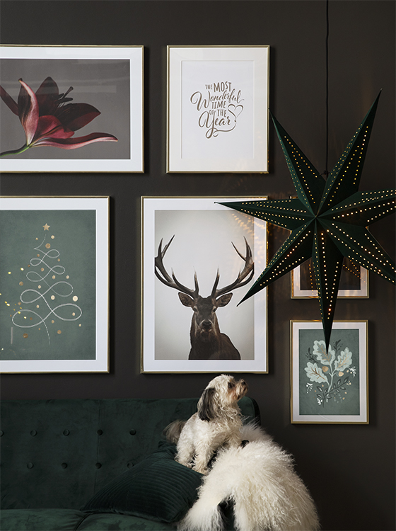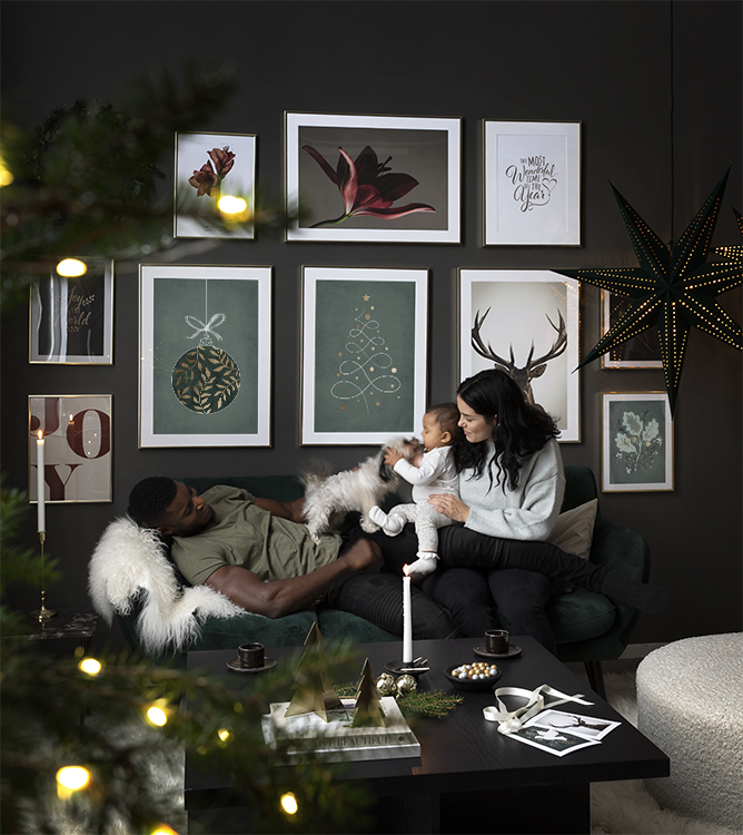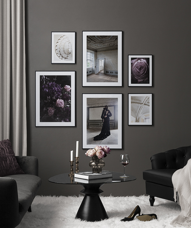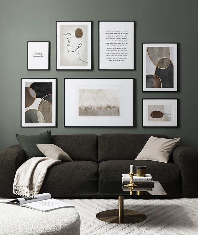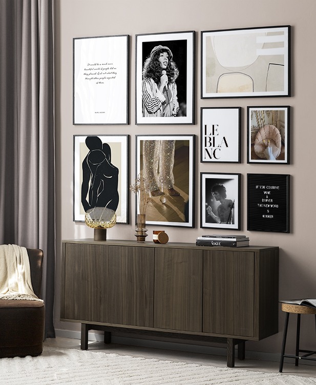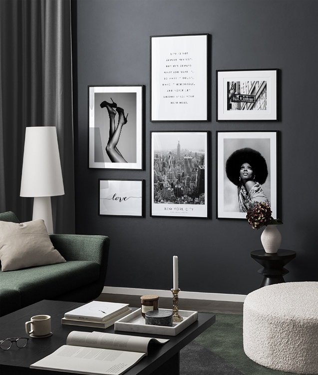 Hvis du vil ha et mer stilrent interiør i stuen, kan du velge å bruke en eller to store plakater som fyller ut tomrommet. Det gir også stort fokus på motivene du har valgt. Bruk kunsten på veggene dine til å fortelle hvem du er. Flatene i en stue gir uendelige muligheter. Bygg bildevegger fra gulv til tak, i et hjørne eller rundt et møbel – finn inspirasjon i inspirasjonsbildene våre.