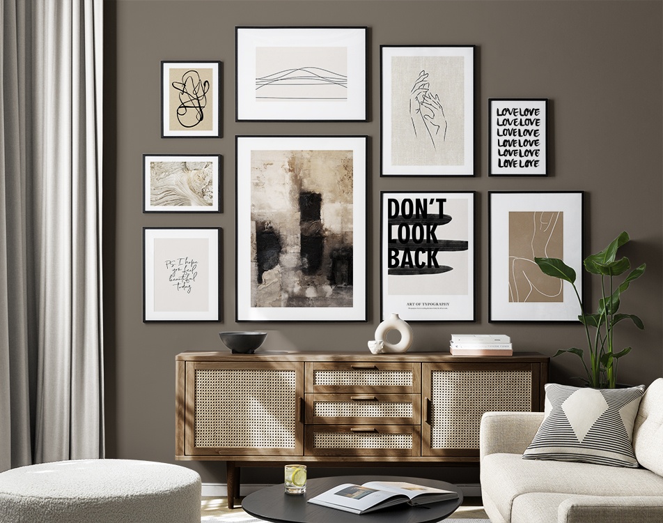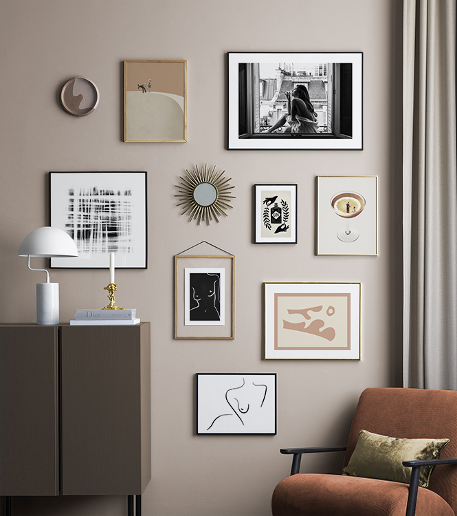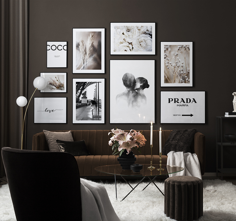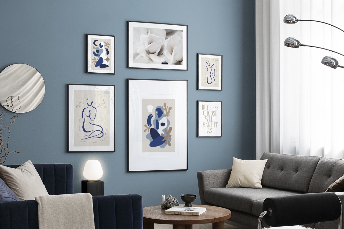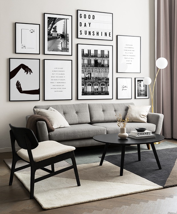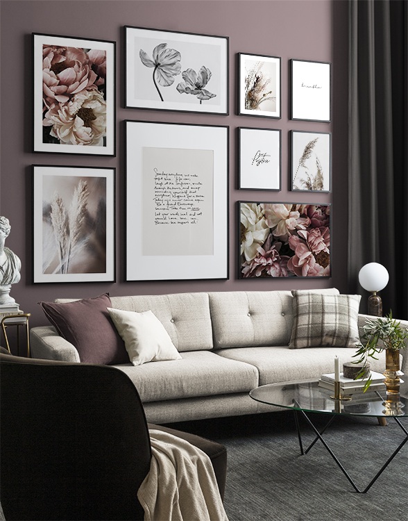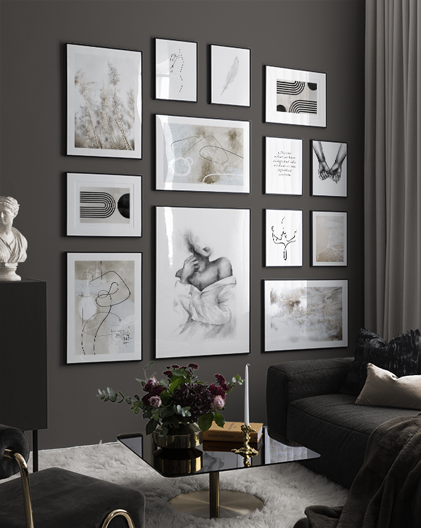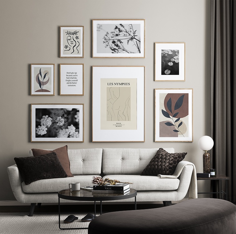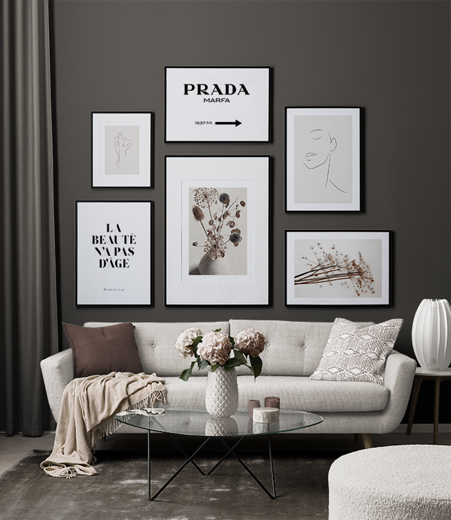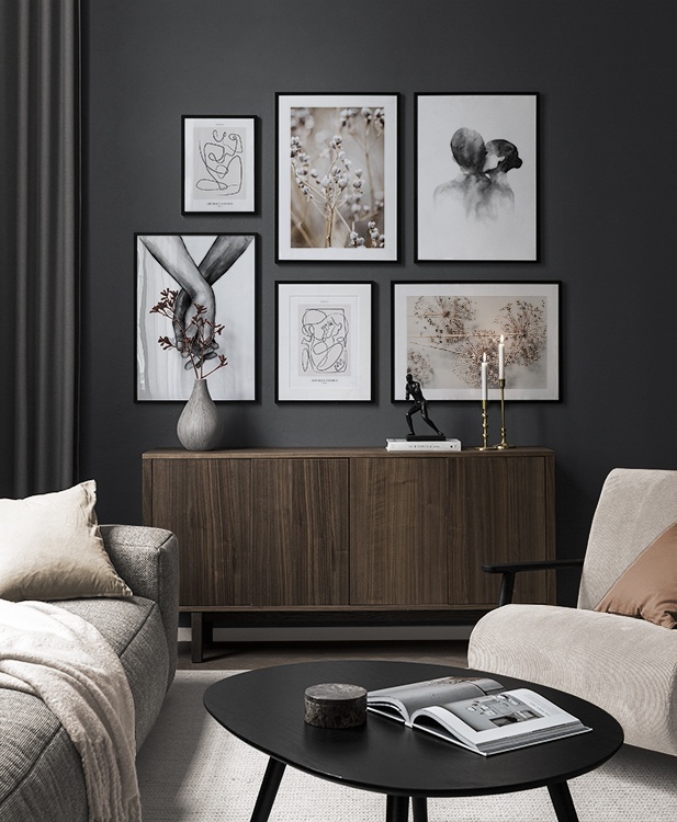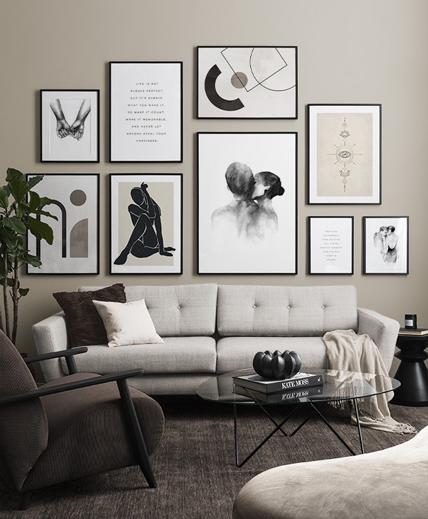 Finn inspirasjon og interiørtips til hvordan du kan fylle de store veggene i stuen med bilder og veggdekorasjoner. Stuen er ofte det største rommet i hjemmet, og de romslige veggene er perfekte for å skape en effektfull bildevegg. Bruk gjerne plakater i forskjellige størrelser og formater for å skape en bildevegg som virker levende og som gjenspeiler personligheten din.