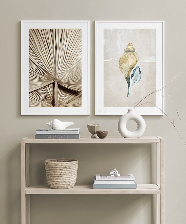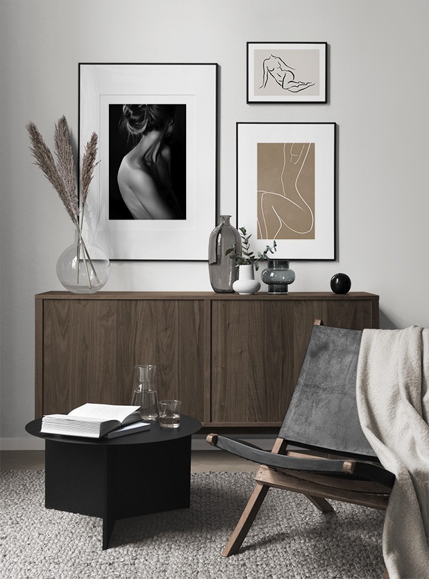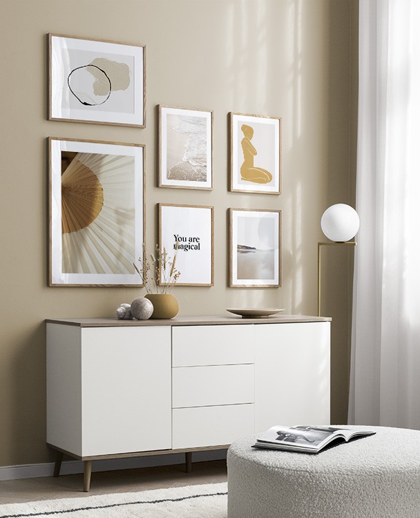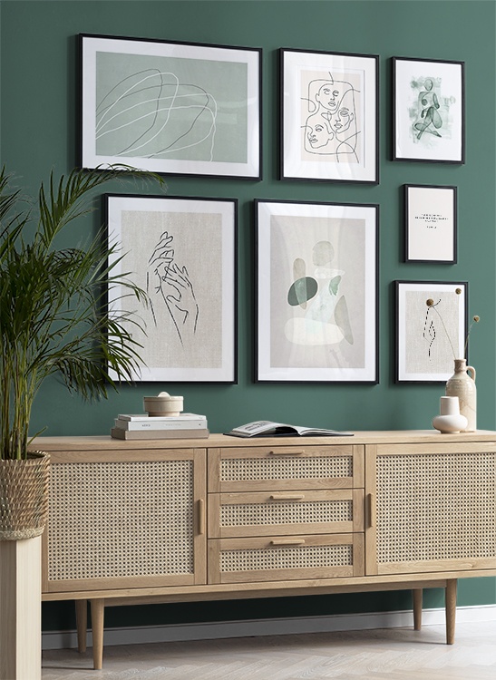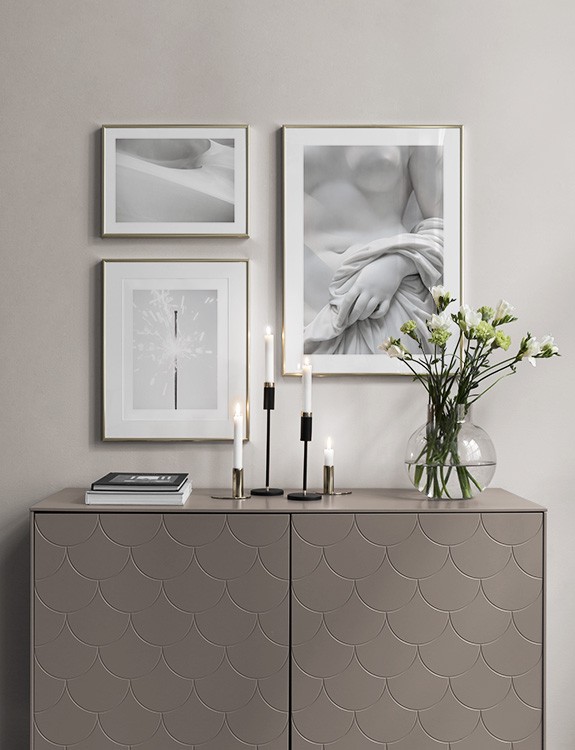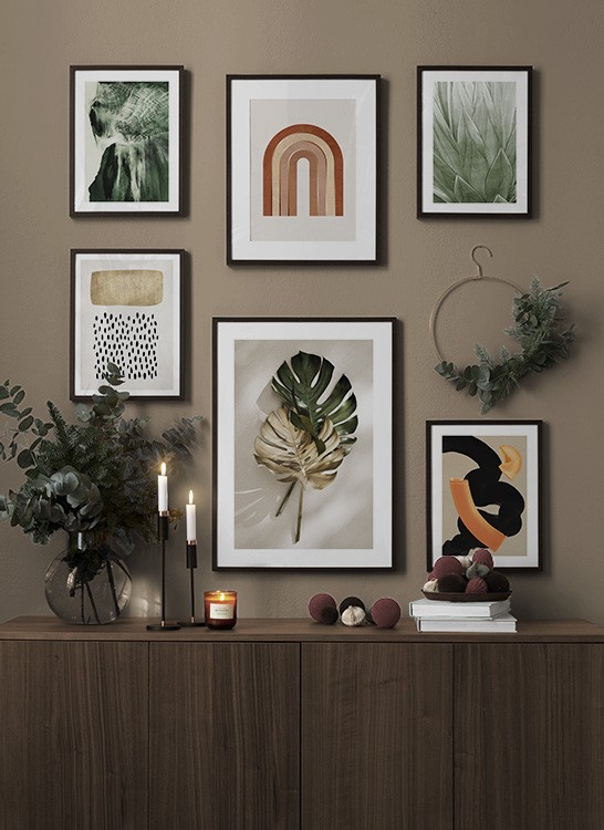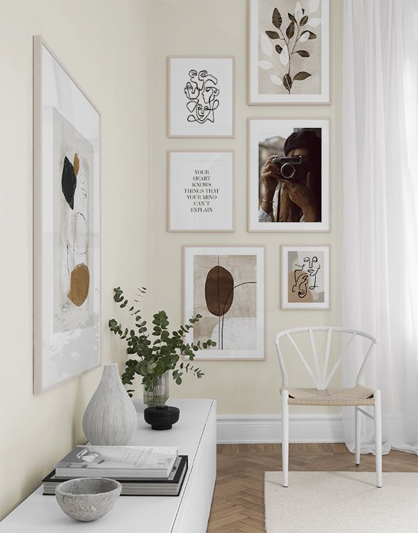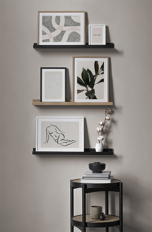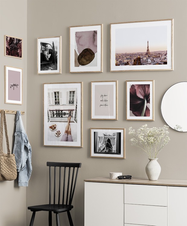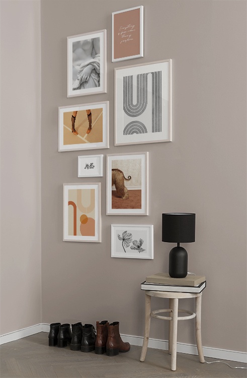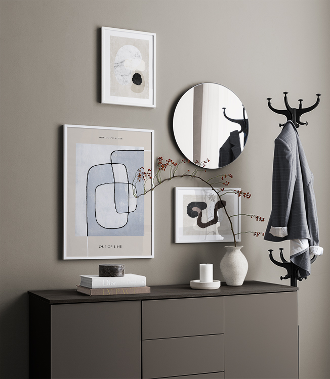 Et av de beste tipsene våre er å bruke oppbevaringen til å plassere kunsten din på. Du trenger ikke alltid å bore i veggene. La bildene stå på kommoden eller benken, opp mot veggen, og bygg et vakkert stilleben rundt kunsten. Det gjør det enkelt å variere interiøret og tilpasse det etter sesong og humør. Hvis du foretrekker å henge opp kunsten, kan du bygge en moderne bildevegg som passer til både små og store vegger i gangen.