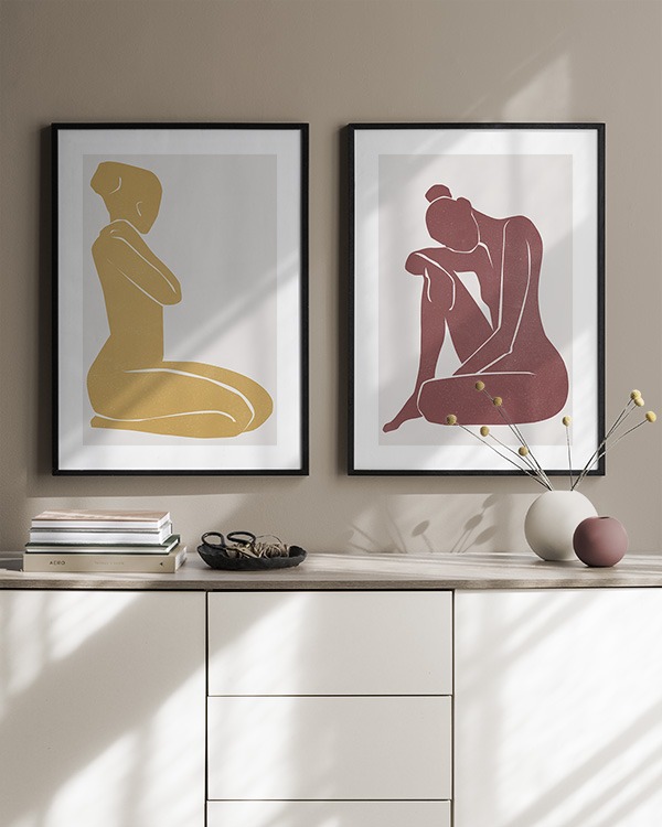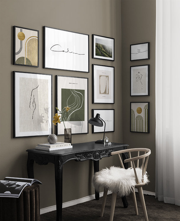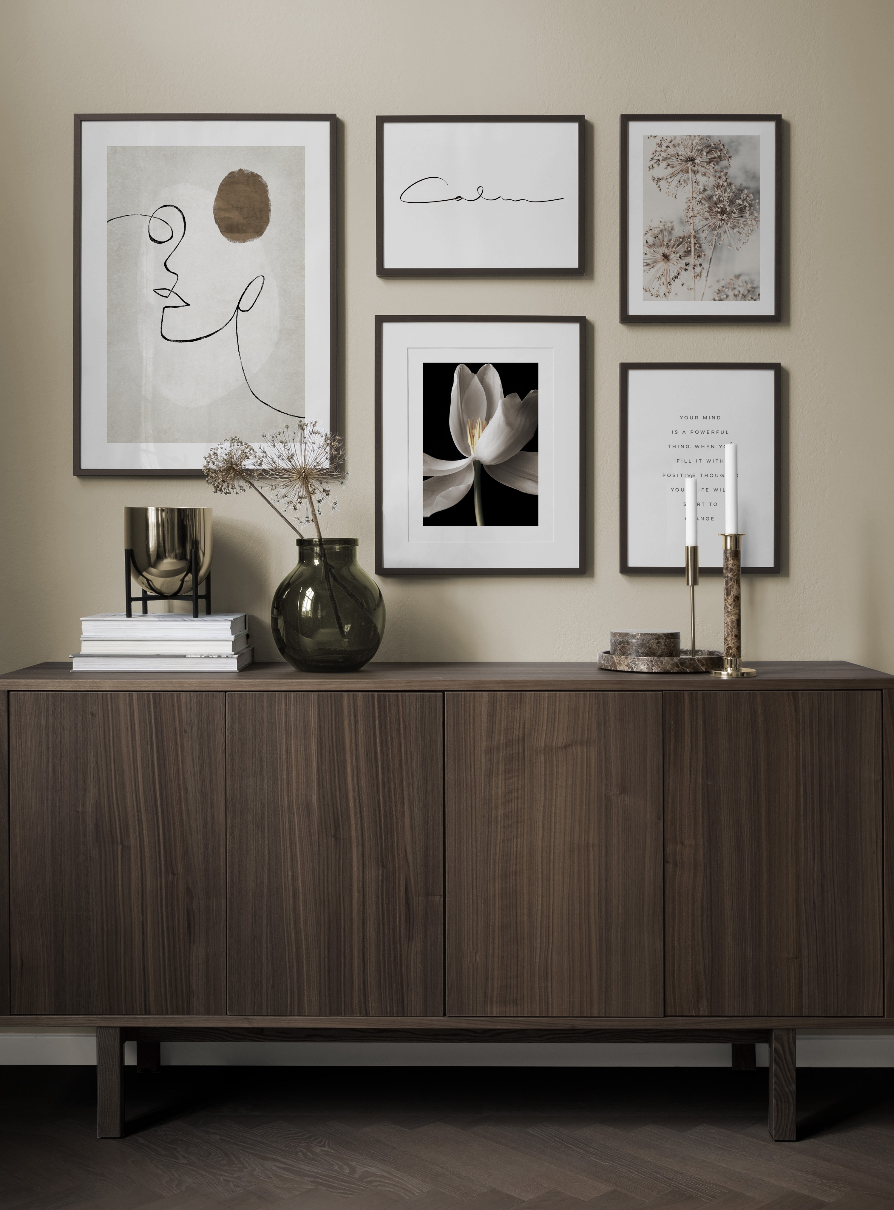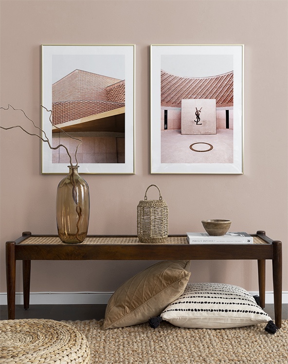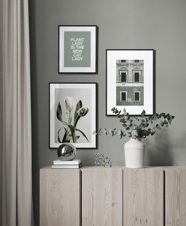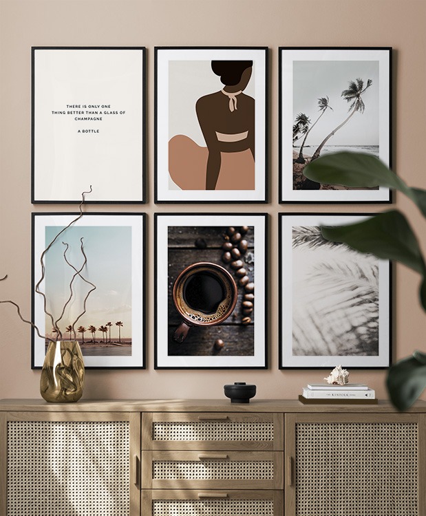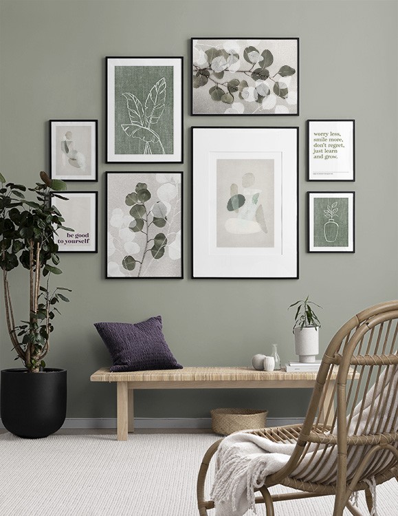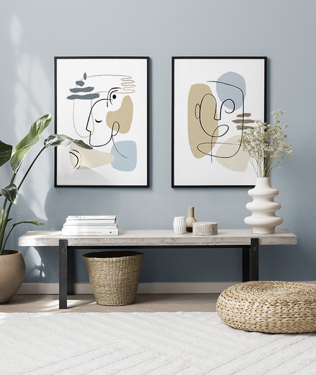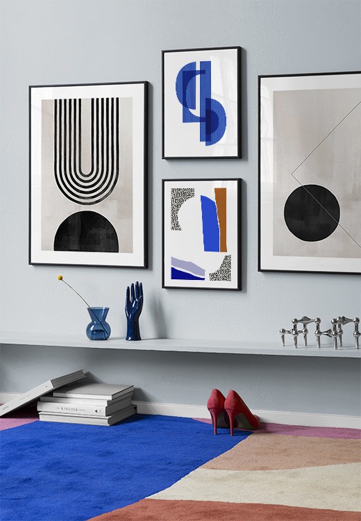 Et av de beste tipsene våre er å bruke oppbevaringen til å plassere kunsten din på. Du trenger ikke alltid å bore i veggene. La bildene stå på kommoden eller benken, opp mot veggen, og bygg et vakkert stilleben rundt kunsten. Det gjør det enkelt å variere interiøret og tilpasse det etter sesong og humør. Hvis du foretrekker å henge opp kunsten, kan du bygge en moderne bildevegg som passer til både små og store vegger i gangen.