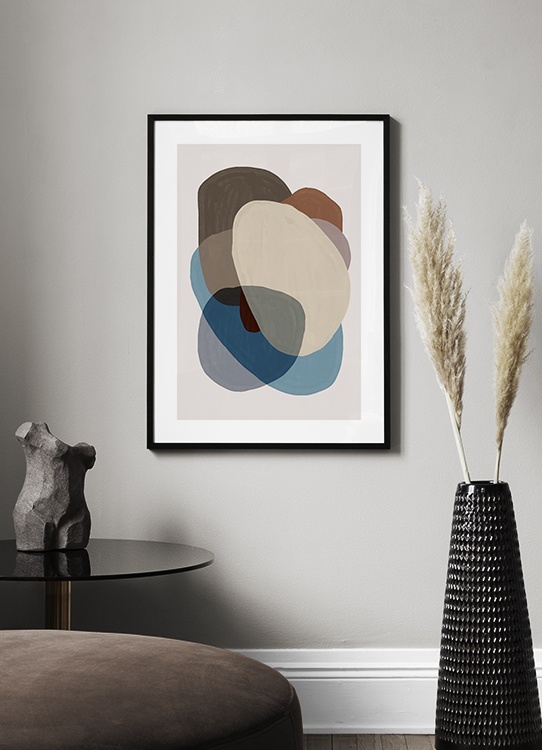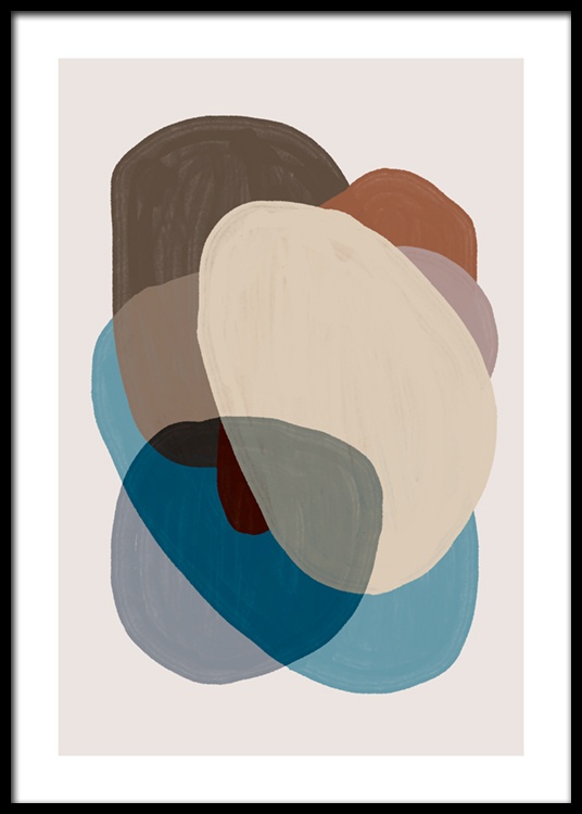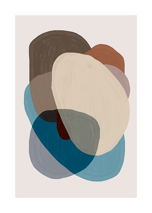 Handpicked Maleri med overlappende blå, beige og brune former mot en beige bakgrunn. Jordfargene på denne plakaten gir hjemmet en moderne og avslappet atmosfære. Den passer perfekt sammen med Browns and Blues No1!