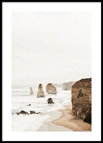 Handpicked Fotografi av en strand med en lang klippe med rolig hav i bakgrunnen. Med sin myke og nøytrale fargepalett tar naturen virkelig pusten fra oss hver gang. Utforsk vår kategori med naturplakater for å finne matchende motiver!