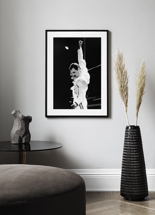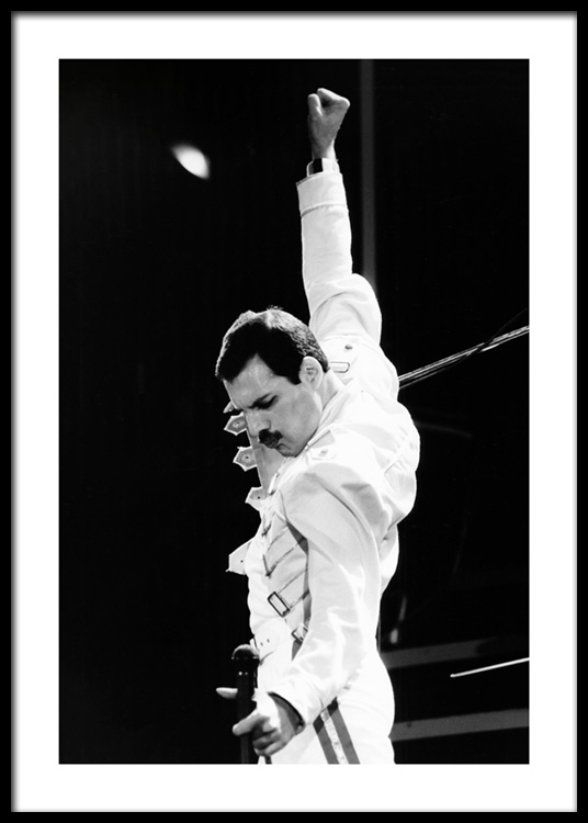 Fra 185,50 krIkonisk svarthvitt-fotografi av Freddie Mercury fra Queen, kledd i hvitt og med hånden i været. Hvis du har et favorittikon, kan det hende du finner ham eller henne blant våre ikoniske fotografier!