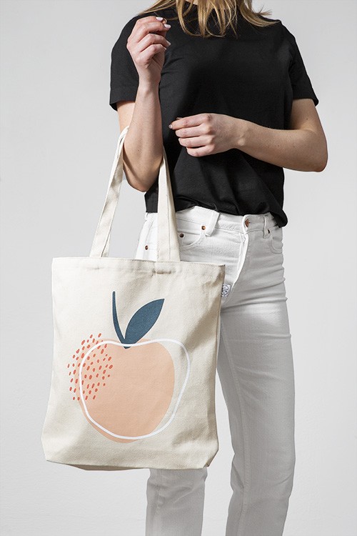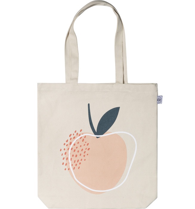– Beige tote bag med en illustrasjon av en fersken, rosa prikker og en hvit sirkel trykt på forsiden