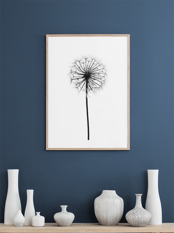 Handpicked Liten plakat med fint, svarthvitt botanisk foto av en løvetann på hvit bakgrunn. Stilren utførelse som utgjør en fin detalj som plakat på veggen, og stilig som en bildecollage på veggen med andre botaniske plakater og posters. Plakaten er trykket på matt, ubestrøket papir av høy kvalitet. Ramme er ikke inkludert, men kan kjøpes i svart og hvitt under kategorien Rammer.