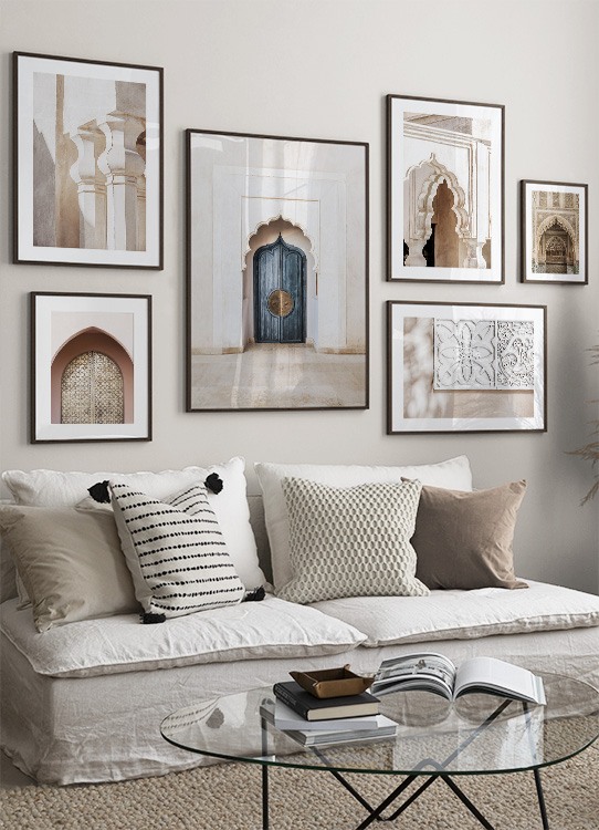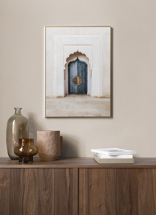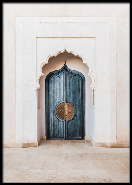 Handpicked Fotografi av en blå dør med gylne håndtak, med en bue foran. Arkitekturen i Marrakech er svært detaljert. Mange kjenner til den, og vi blir stadig forbløffet over hvor vakker den er! Denne plakaten er en del av Studio Amara, en fotokolleksjon som er laget av Desenio Design Studio i Marrakech.