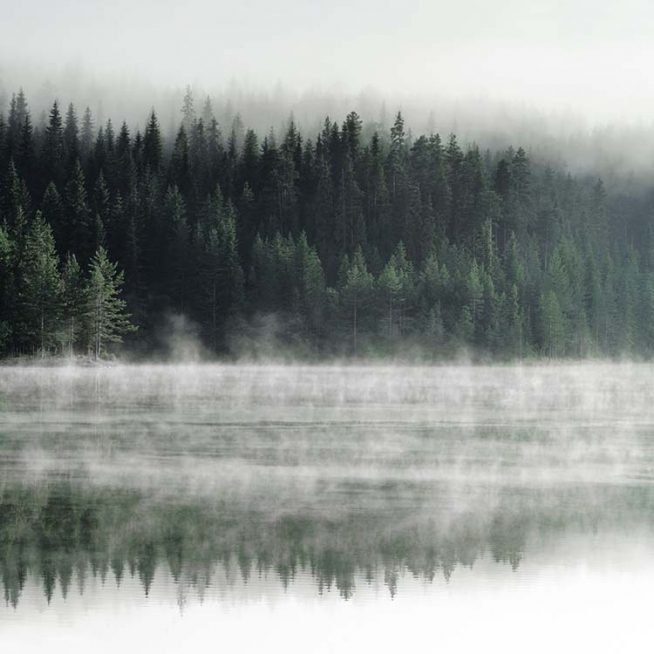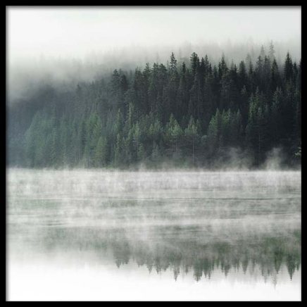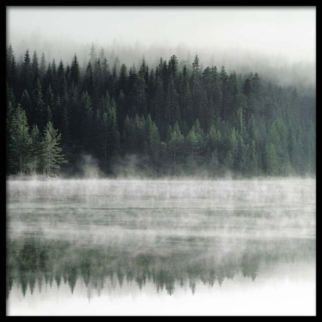 Handpicked Naturfotografi av skog og innsjø med tåke som slynger seg over vannet. Plakaten har kvadratisk format og passer fint på en bildevegg sammen med plakater i klassiske, rektangulære former for å skape dynamikk og kontraster. Se flere av de kvadratiske plakatene våre i størrelsen 50 x 50 cm.