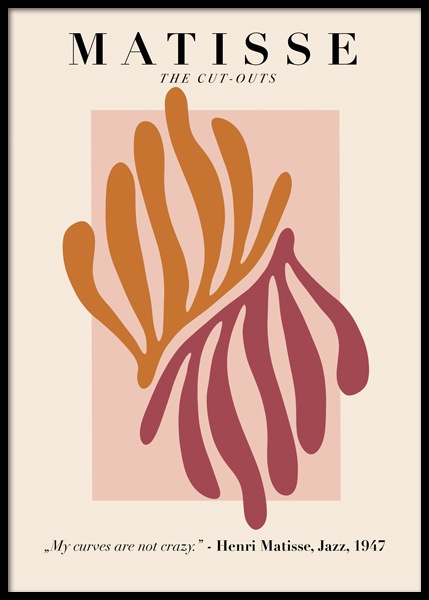 Handpicked Kunstillustrasjon med rosa og røde korallformer mot en rød og rosa bakgrunn, med teksten «Matisse» øverst mot en beige bakgrunn. Gi hjemmet en moderne og unik stil med vår Matisse-kolleksjon! Litt ekstra farge forvandler raskt stua.