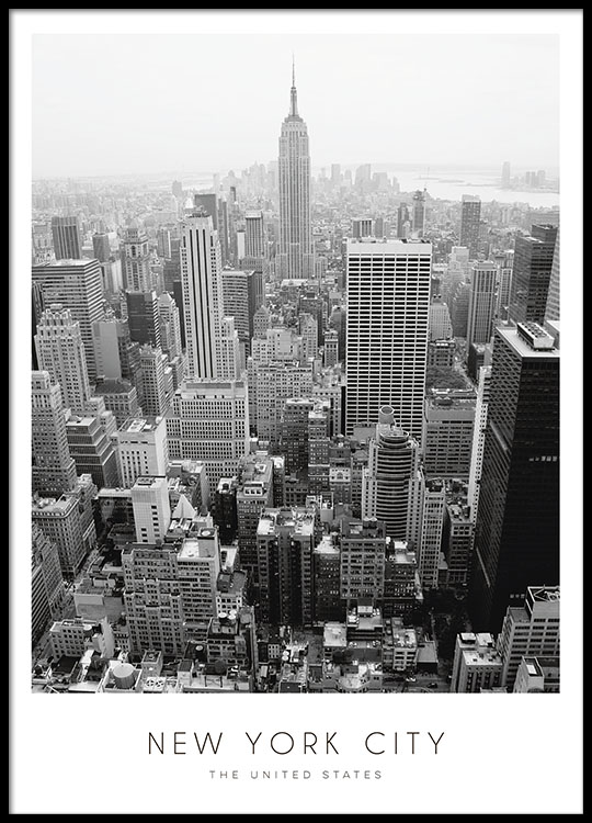 Handpicked Svarthvitt-fotografi av bygninger i New York, med teksten «New York City The United States» under. Denne plakaten i retrostil passer fint sammen med forskjellige stiler og i flere rom, perfekt hvis du vil supplere din skandinaviske interiørstil.