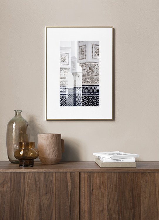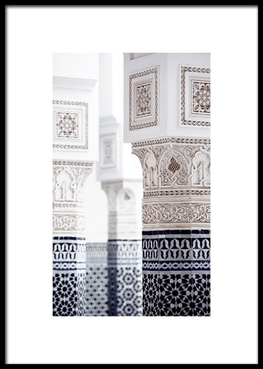 Handpicked Nærbilde av søyler med blå og hvite mønstre. Med sine vakre pastellfarger og elegante mønstre vil fotokunst fra Marrakech gi hjemmet ditt en helt ny stil! Denne plakaten er en del av Studio Amara, en fotokolleksjon som er laget av Desenio Design Studio i Marrakech.