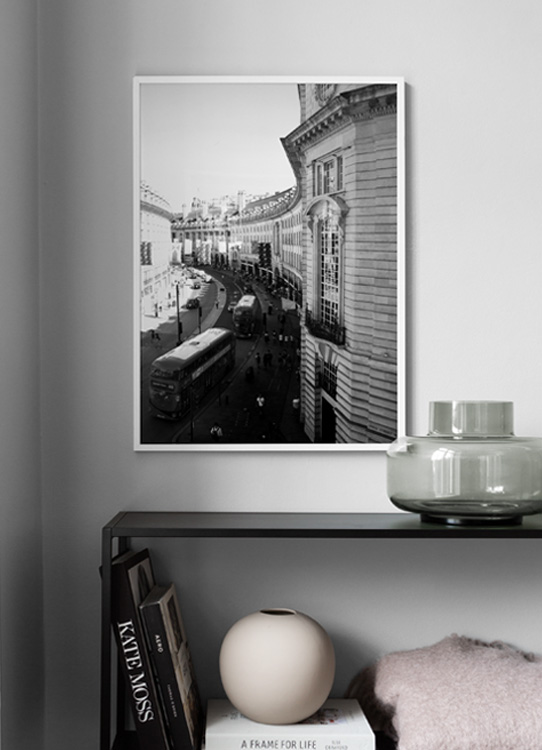 Handpicked Regent Street er en av de mest levende gatene i London, med butikker som strekker seg langs hele den lange gaten. Dette svarthvitt-motivet, som er en del av fotokolleksjonen Studio Cosmopolitan, viser gaten med de vakre bygningene, dobbeldekker og mennesker – akkurat slik mange ser for seg at London er.