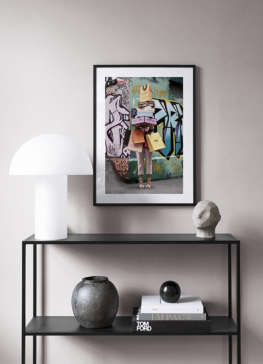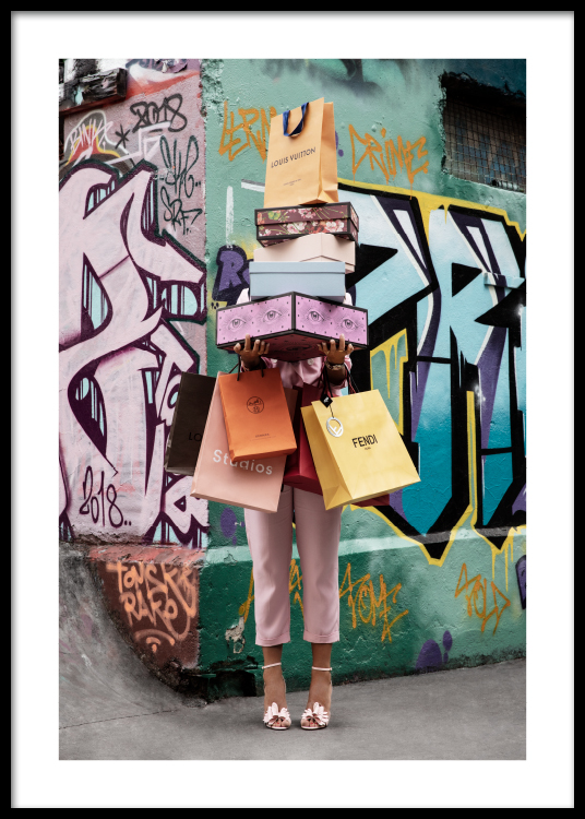 Handpicked Fotografi av en kvinne som holder handleposer og esker foran seg, med en graffitivegg i bakgrunnen. Motivet er en del av Studio Stadtkind, en fotokolleksjon som er produsert og fotografert av Desenio Design Studio, med den tyske influenseren Aylin König som modell og muse.