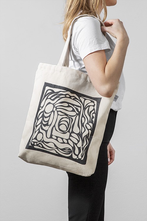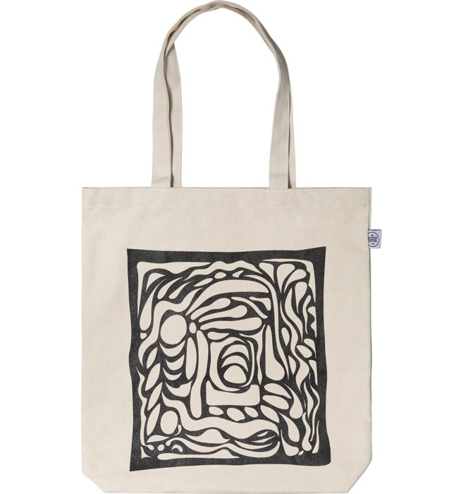 – Beige tote bag med abstrakt illustrasjon i svart trykt på fronten