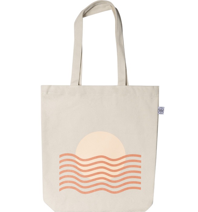 Handpicked Tote bag i naturlig beige med en grafisk illustrasjon av en oransje sol og bølger. En fargerik tote bag er det perfekte hverdagstilbehøret! Vår Limited Edition Kolleksjon med tote bags er printet i Sverige og lagd av 100% resirkulert bomull.
