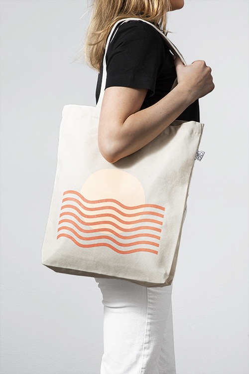– Beige tote bag med solnedgang og oransje bølger trykt på forsiden
