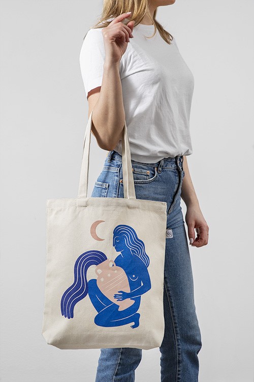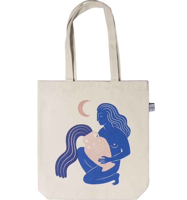 – Beige tote bag med en kvinne som holder en vase, malt i blått med en halvmåne over, trykt på forsiden