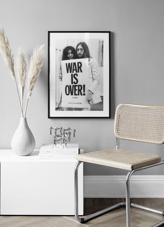 Handpicked Svarthvitt-fotografi av ikonene John Lennon og Yoko Ono som holder en plakat med teksten «War is Over». Dette er et av verdens mest ikoniske fotografier, og det ble tatt under John Lennons og Yoko Onos fredskampanje i 1969 med budskapet «War is Over! If you want it».