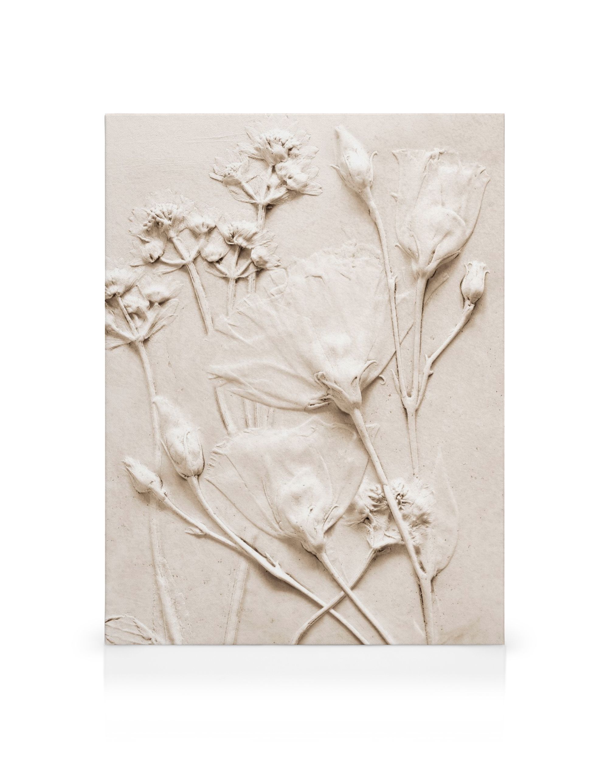 Et vakkert lerretsbilde med pregete blomster i lyse beige toner. Dette lerretsbildet har fine detaljer som gir en rolig og elegant følelse.