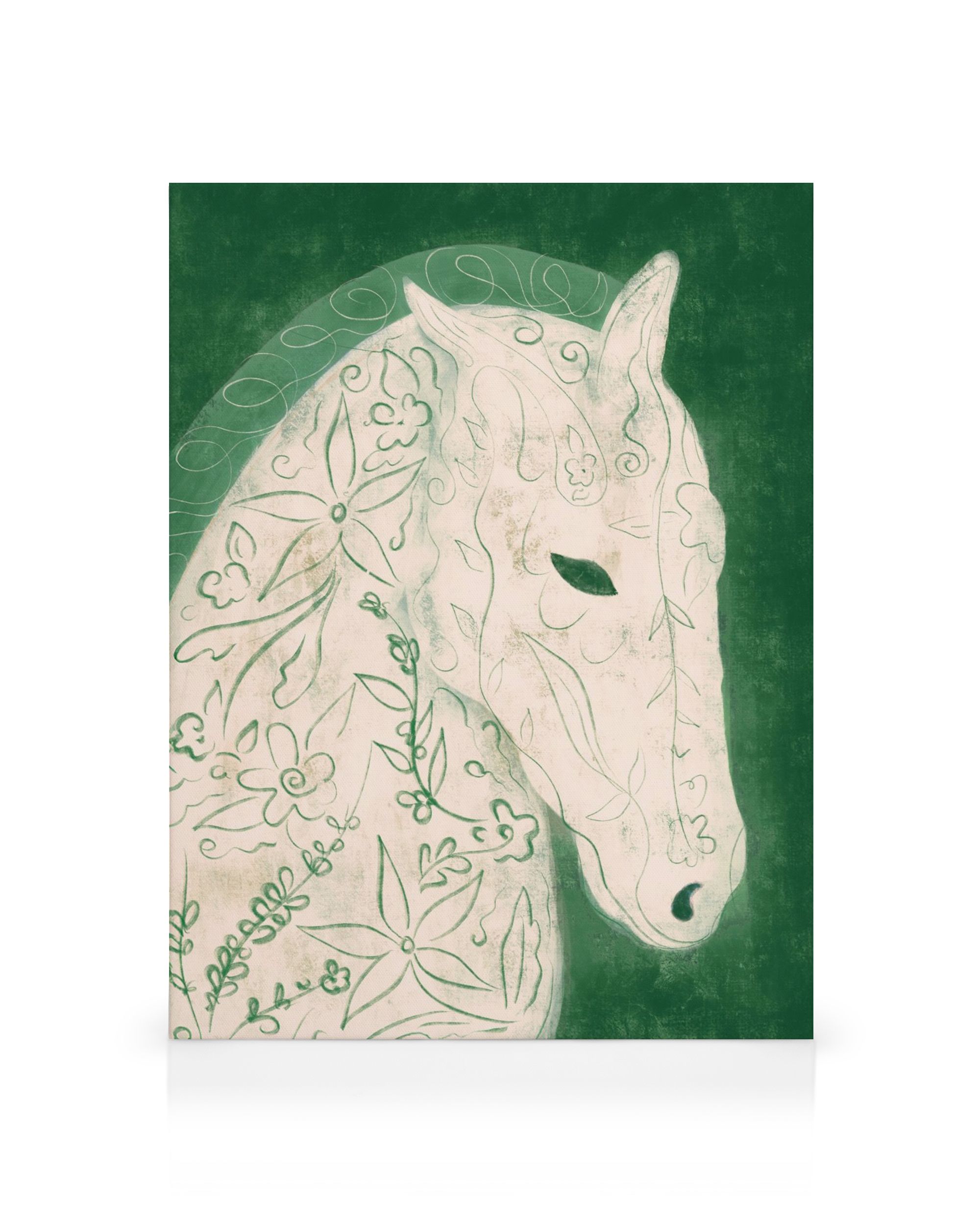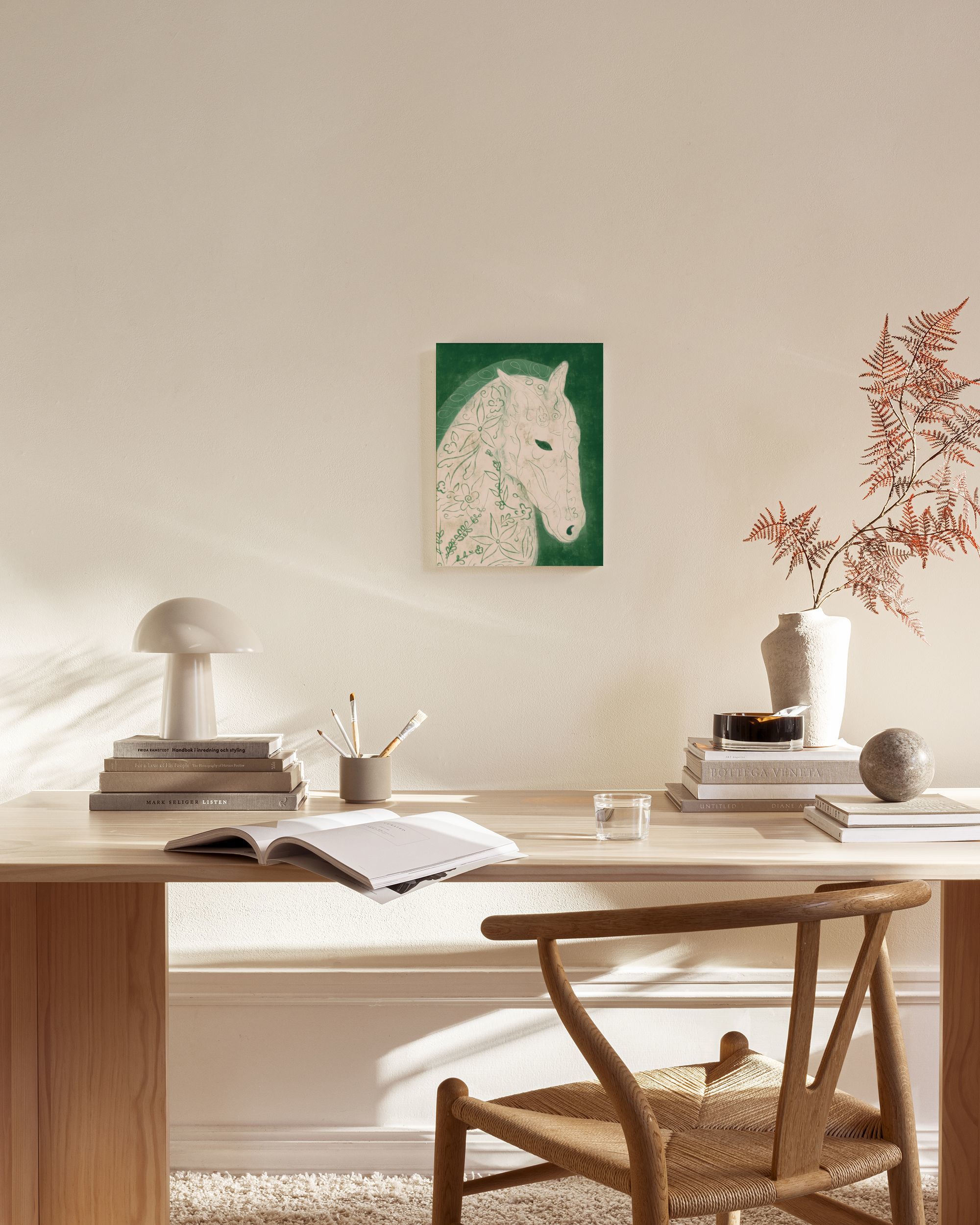 Et vakkert lerretsbilde av en hvit hest med blomster og blader på grønn bakgrunn. Den myke, kunstneriske stilen gir rommet et elegant preg.