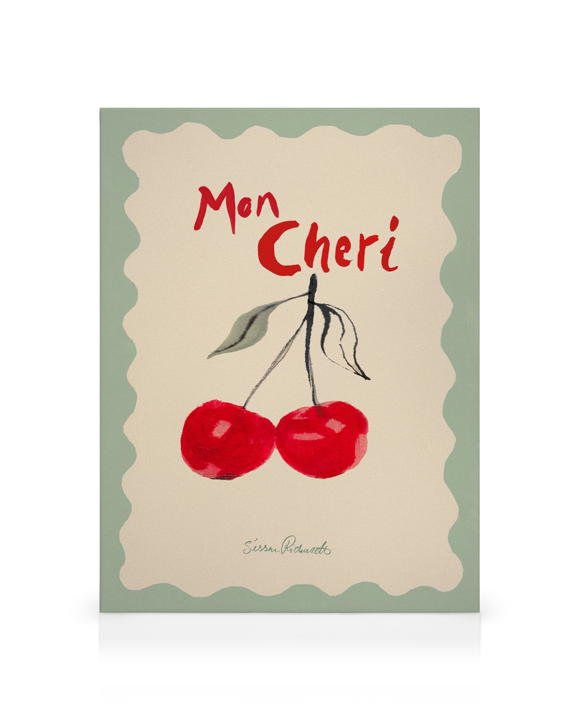 Fra 129 krEt lerretsbilde som viser to røde kirsebær med grønne blader på beige bakgrunn. Teksten "Mon Cheri" er skrevet i rødt over motivet.