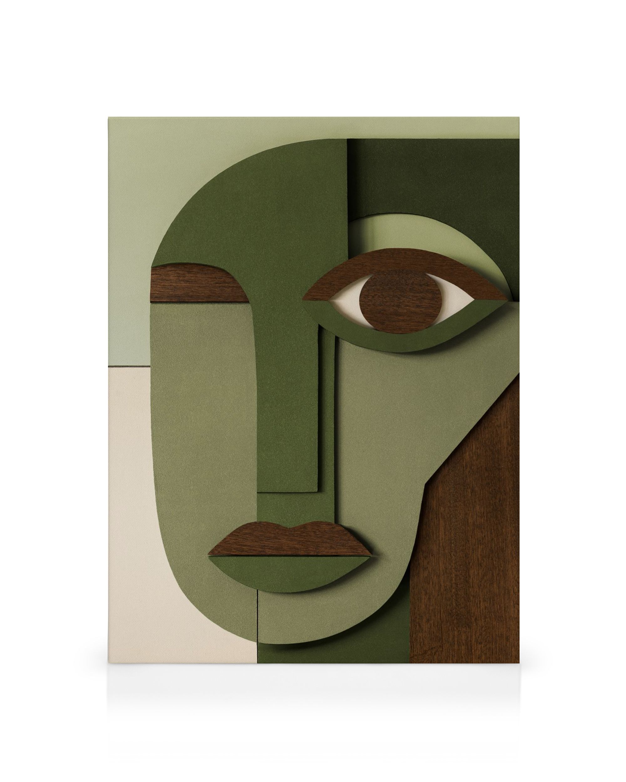 Fra 64,50 krAbstrakt lerretsbilde av et ansikt laget med grønne og brune former. Minimalistisk stil med et stort øye og buede lepper på en lys bakgrunn.