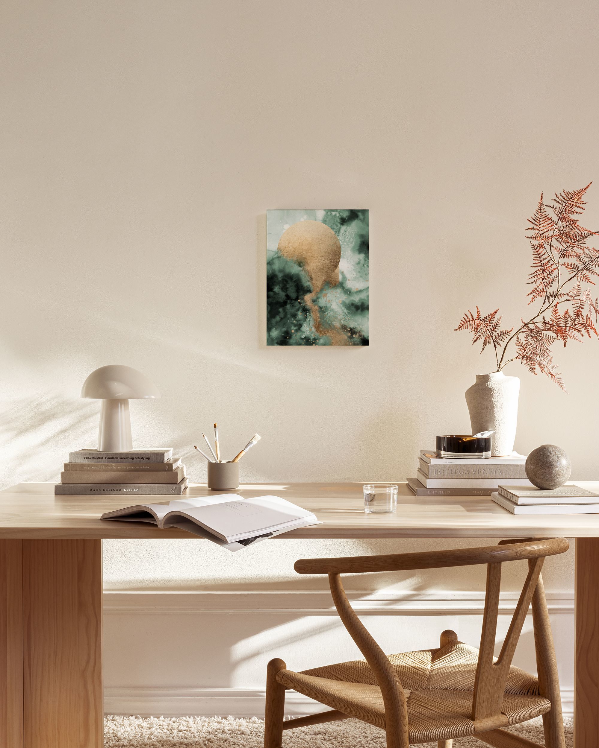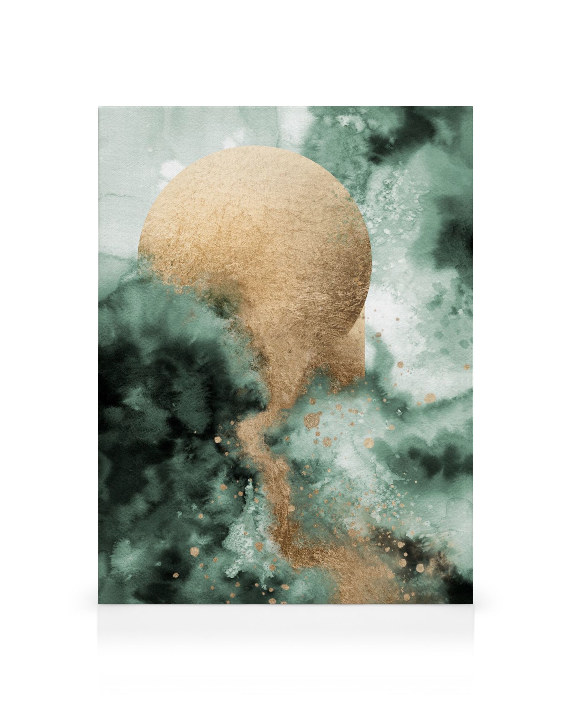 Et vakkert lerretsbilde som viser en stor gullsirkel på en grønn og hvit bakgrunn. Gulldetaljer gir bildet en glitrende effekt mot de mørkegrønne nyansene.