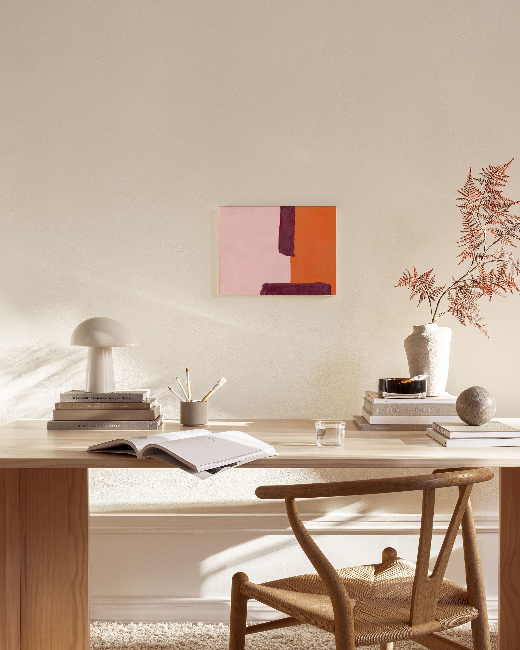 Fra 429 krAbstrakt lerretsbilde med rosa og oransje rektangler separert av mørkelilla striper. Perfekt lerretsbilde for stuen eller soverommet ditt.