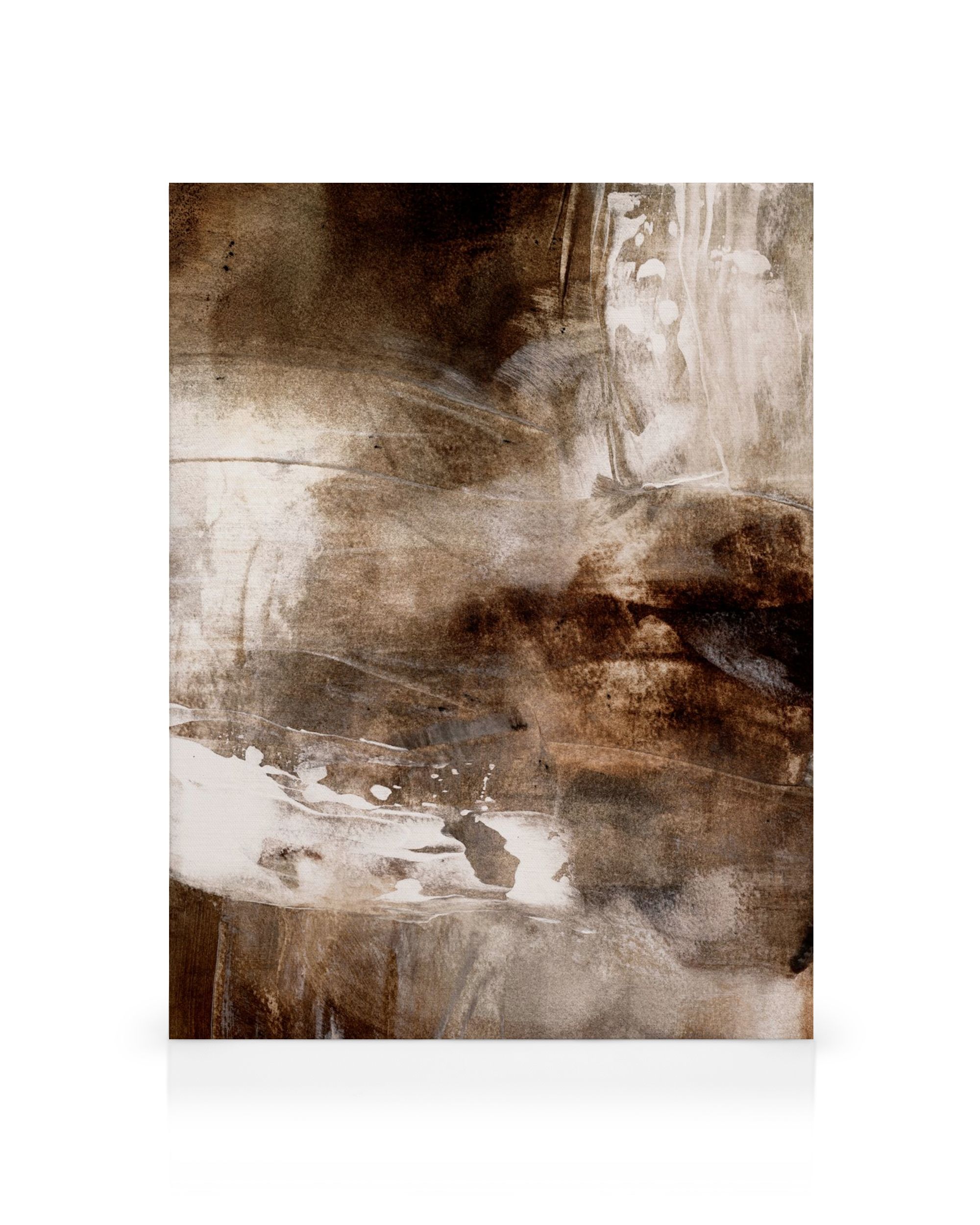 Abstrakt lerretsbilder med brune og beige teksturer i myke, flytende mønstre. Lyse og mørke nyanser blandes sammen med hvite striper for et beroligende uttrykk.