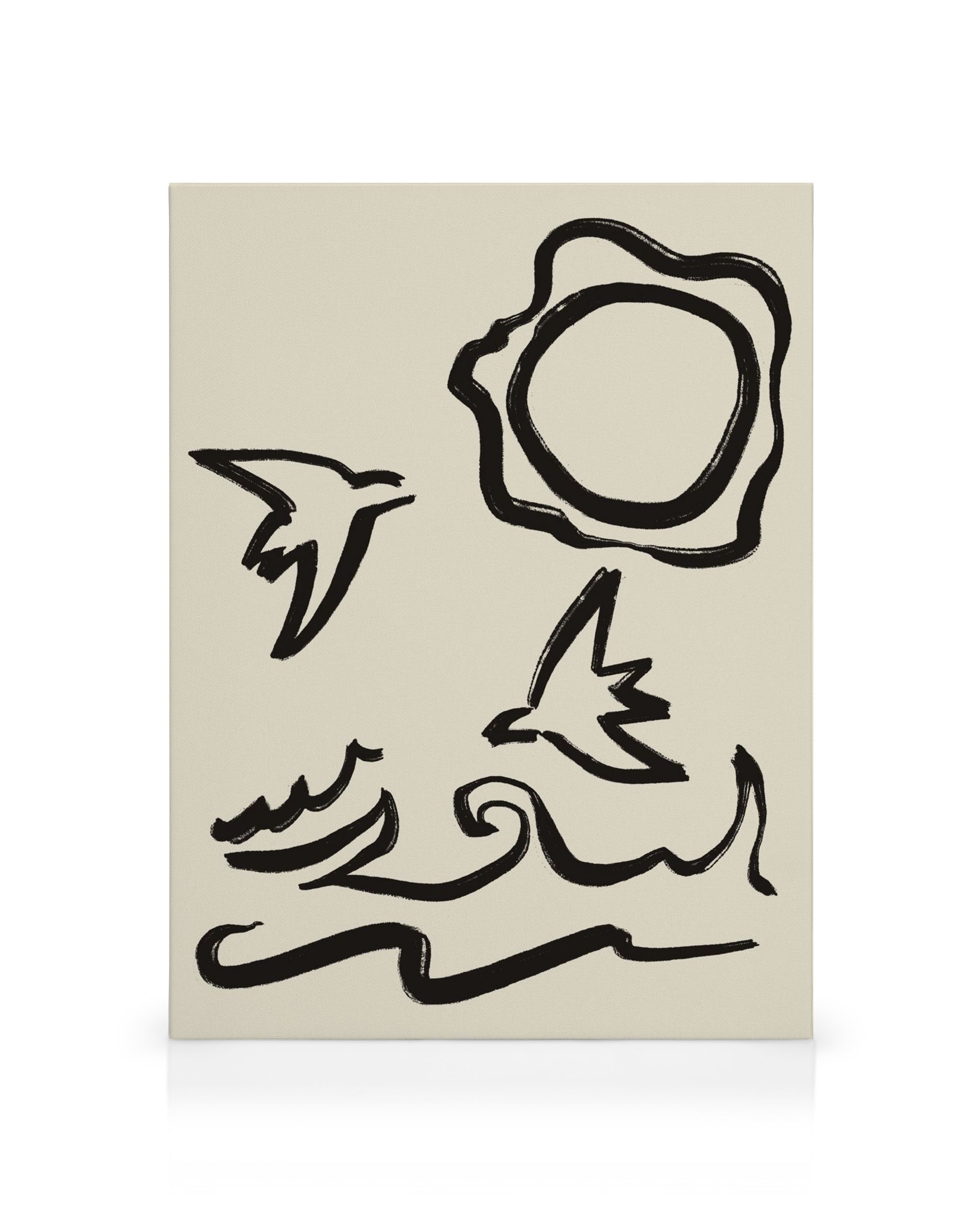 Et vakkert lerretsbilde med to fugler som svever over bølgende vann. De mørke penselstrøkene på lys bakgrunn skaper en rolig stemning.