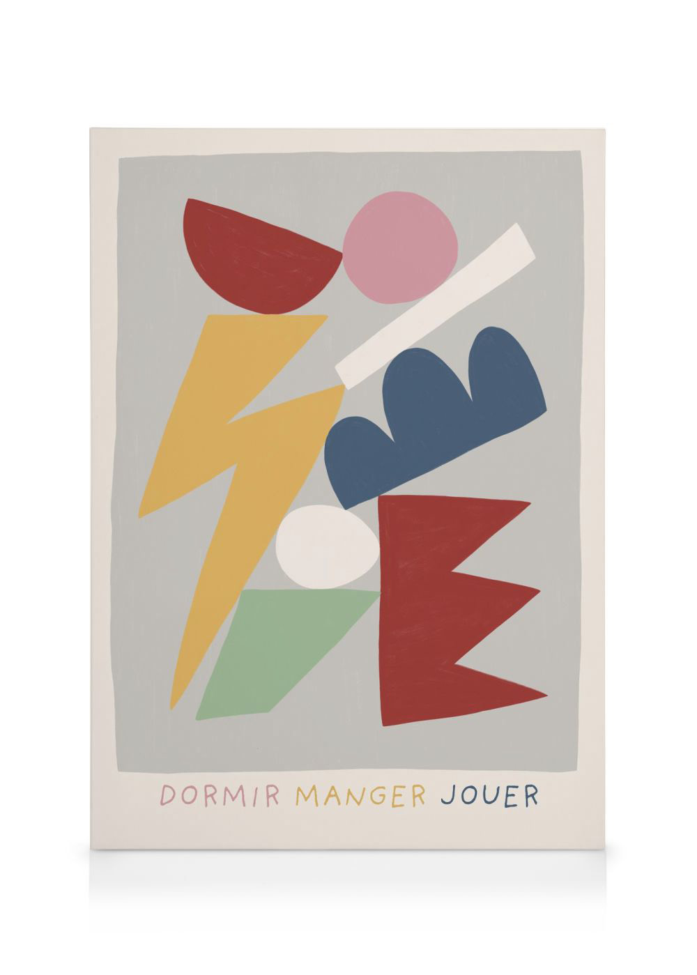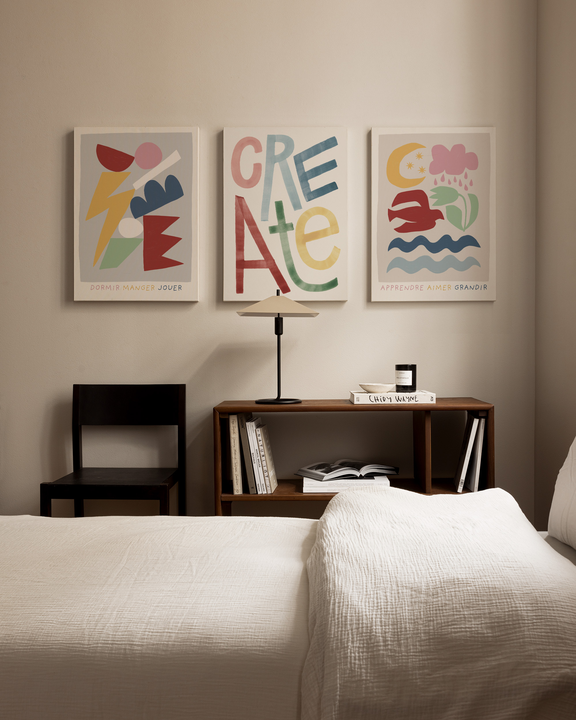 Fra 429 krTre fargerike lerretsbilder med abstrakte former, lysende "CREATE"-tekst, og måne- og blomsterillustrasjoner med franske ord.
