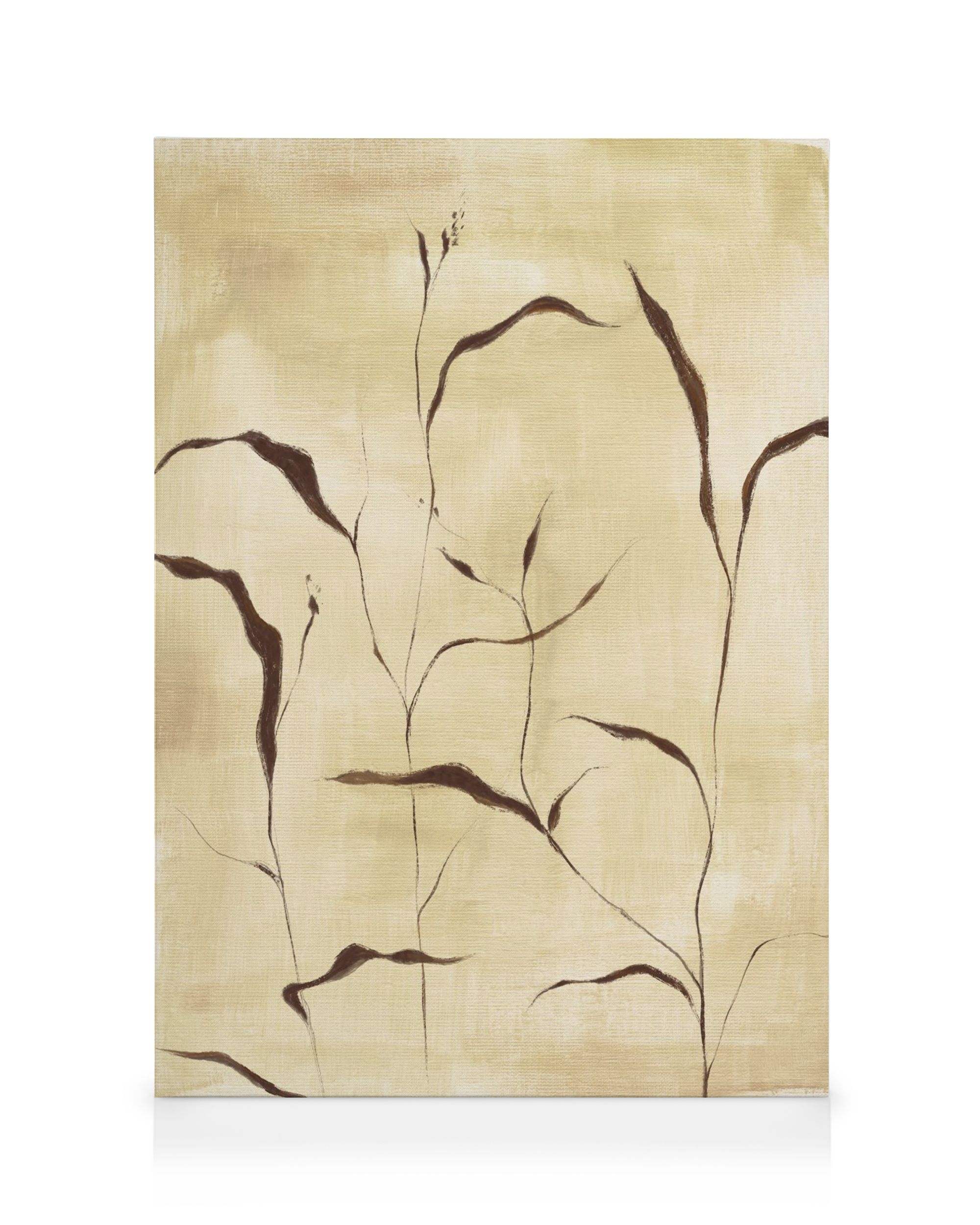 Fra 429 krTre lerretsbilder med abstrakte planteformer, en oppskåret pære og abstrakte design i myke brune og beige toner.