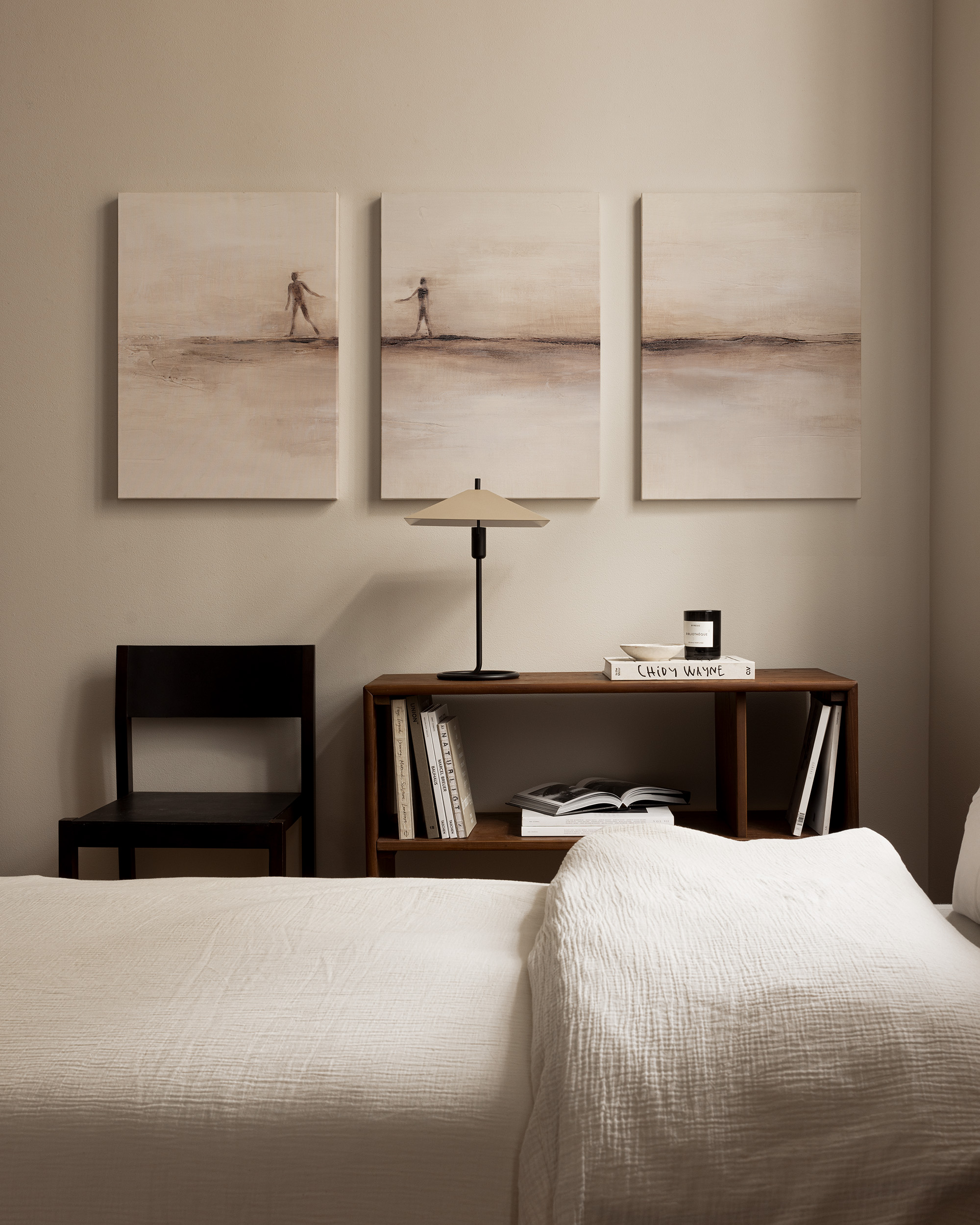 Fra 429 krTre abstrakte lerretsbilder med myke beige og brune toner. Perfekt veggkunst for å skape et rolig og moderne utseende på soverommet ditt.