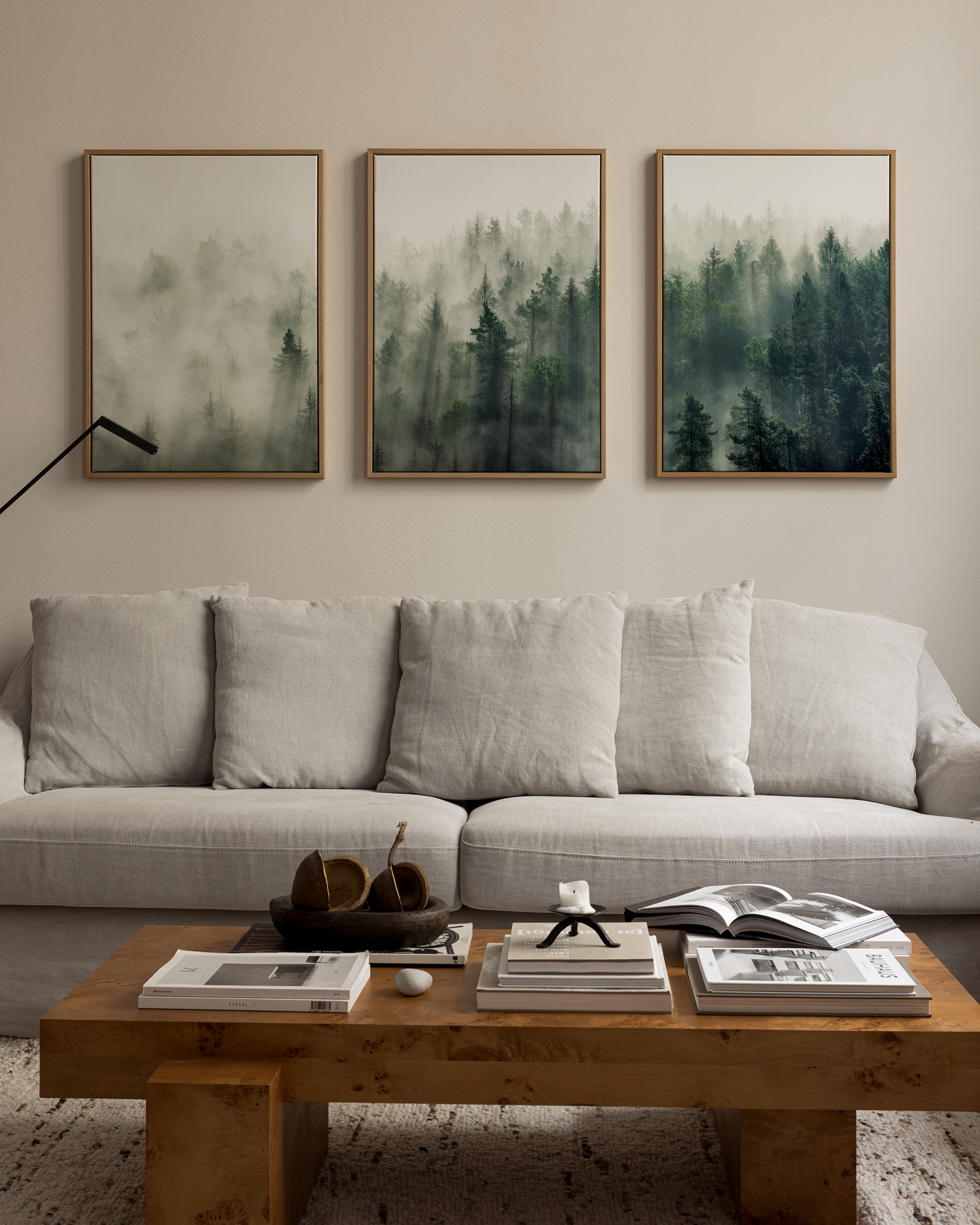 Fra 429 krTre lerretsbilder av tåkete skoger i beroligende nyanser av grønt og beige. Perfekt veggkunst for å skape en fredelig atmosfære i hjemmet ditt.