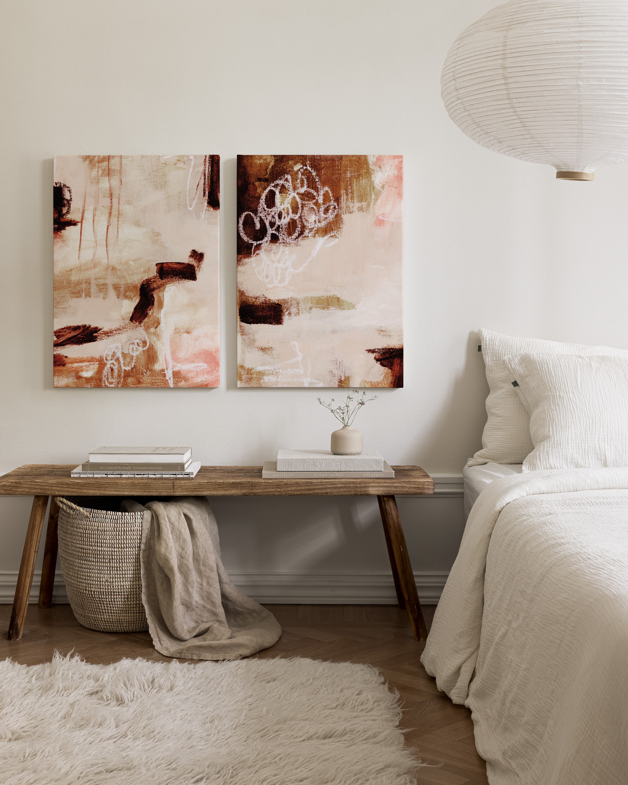 Fra 429 krTo abstrakte lerretsbilder i myke rosa, hvite og brune toner. Perfekt veggkunst for å skape en rolig og koselig atmosfære i hjemmet ditt.