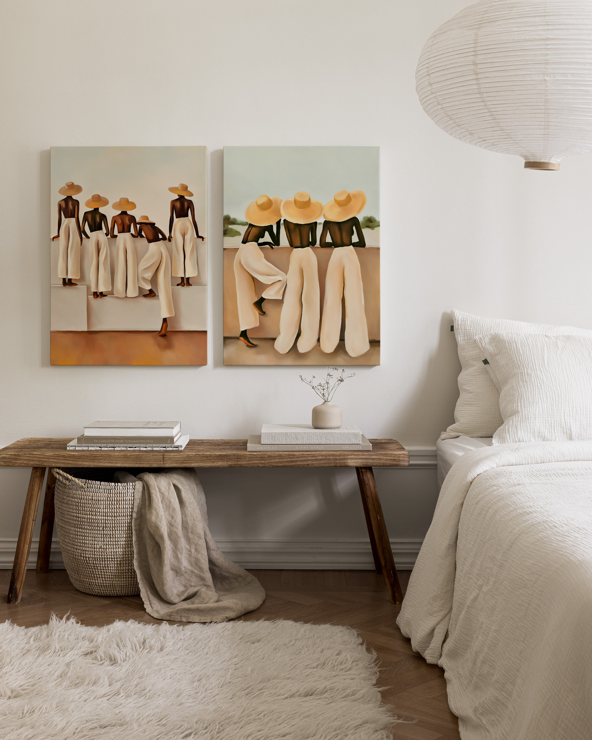 Fra 429 krTo lerretsbilder som viser figurer i store hatter og lange bukser i jordnære brune og beige toner.