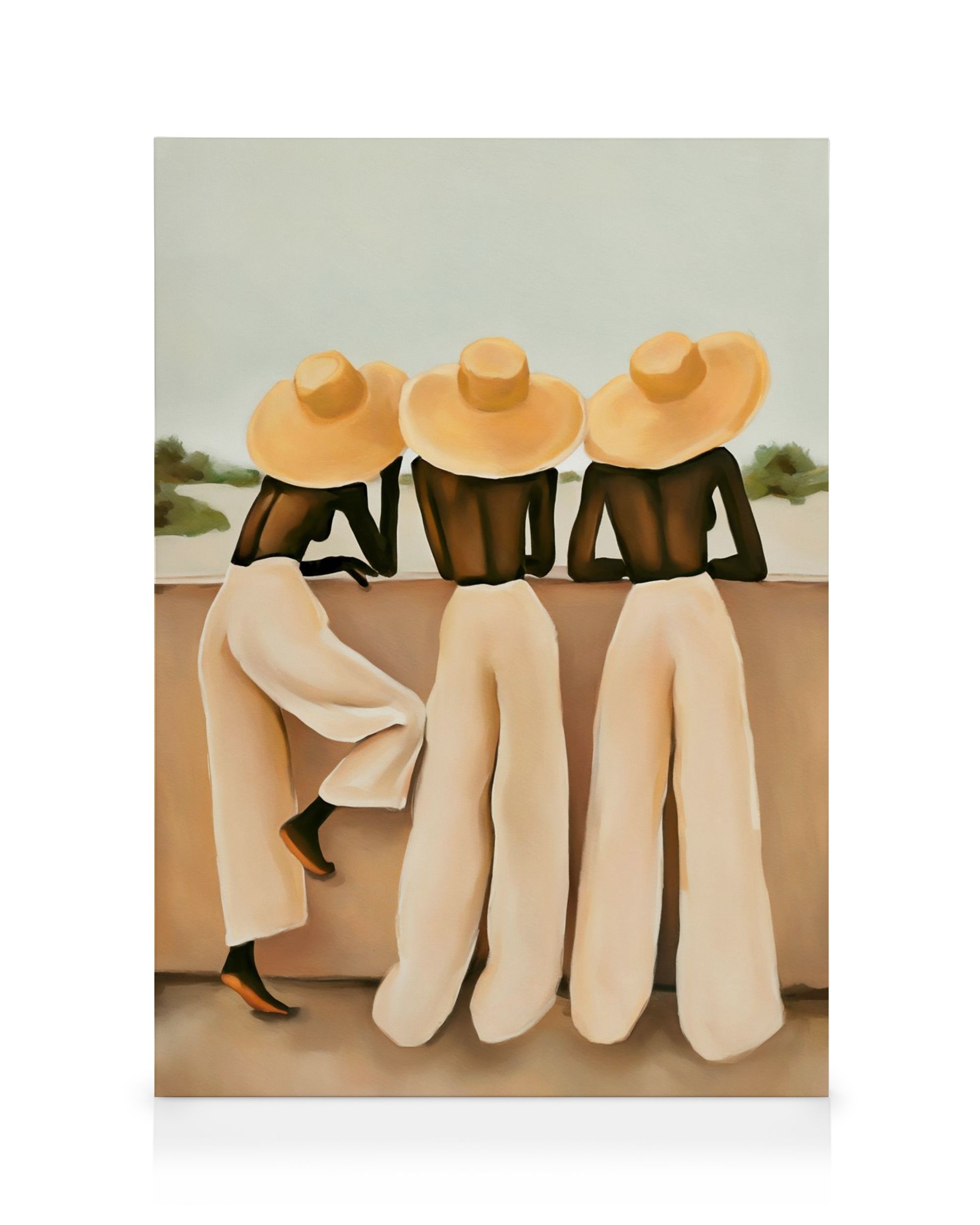 To lerretsbilder som viser figurer i store hatter og lange bukser i jordnære brune og beige toner.
