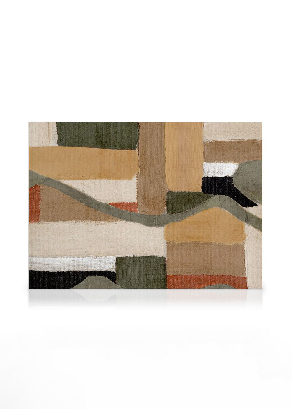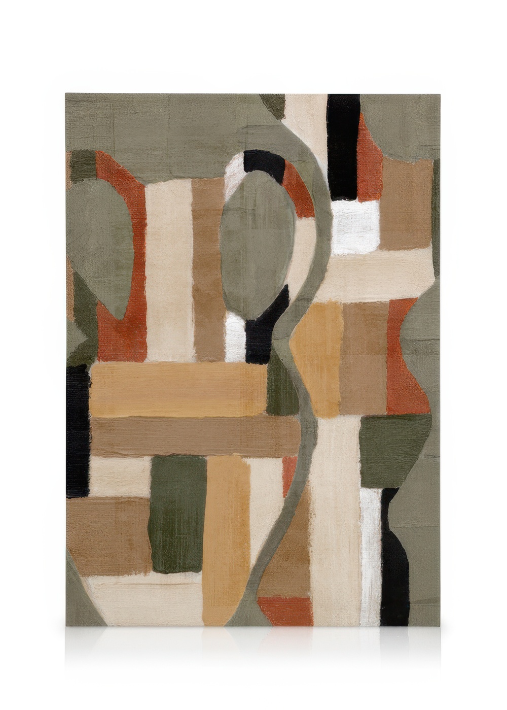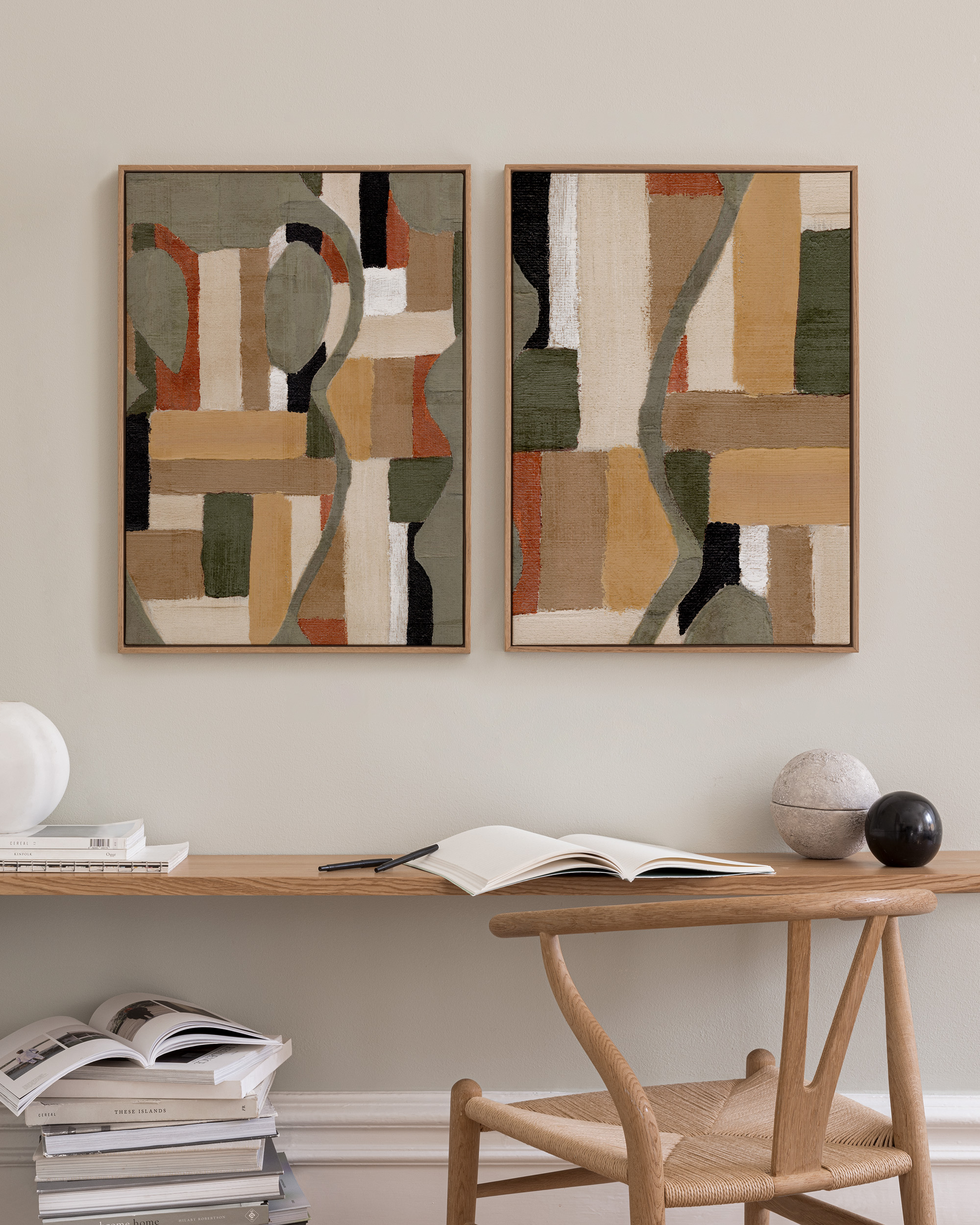 Fra 429 krTo abstrakte lerretsbilder med geometriske former i grønne, brune, svarte, hvite og oransje toner.