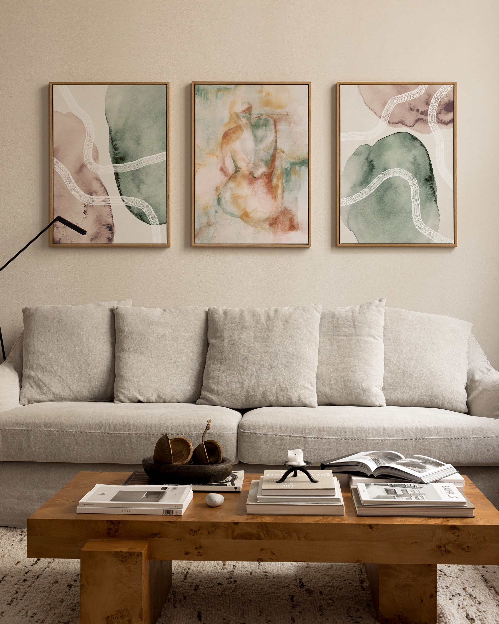 Fra 429 krTre abstrakte lerretsbilder med grønne, beige og rosa toner. Perfekte lerretsbilder for å skape en rolig og jordnær bildevegg i hjemmet ditt.