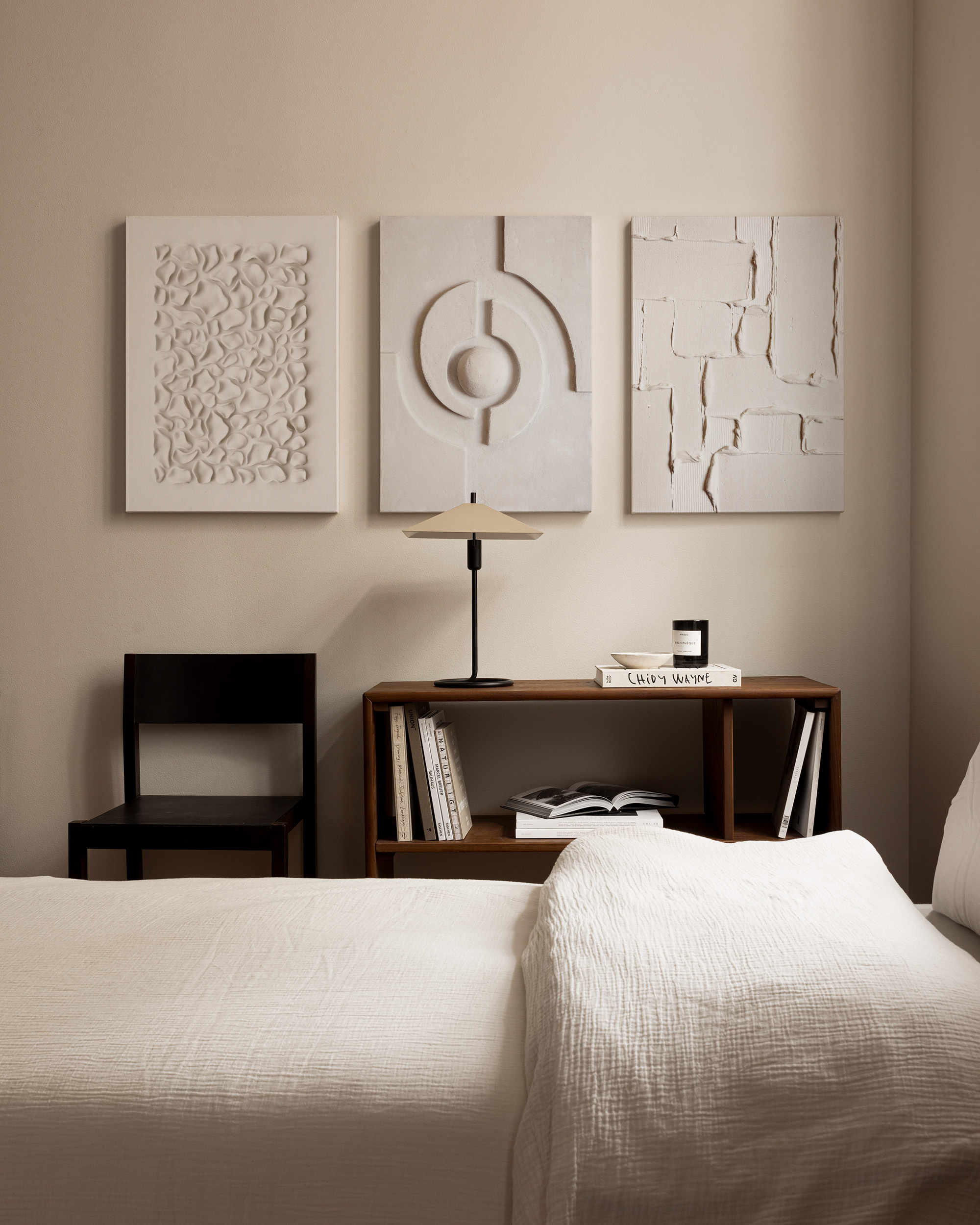 Fra 429 krTre teksturerte hvite mønster lerretsbilder med et rolig og enkelt design. Perfekt veggkunst for å skape en fredelig atmosfære på soverommet ditt.