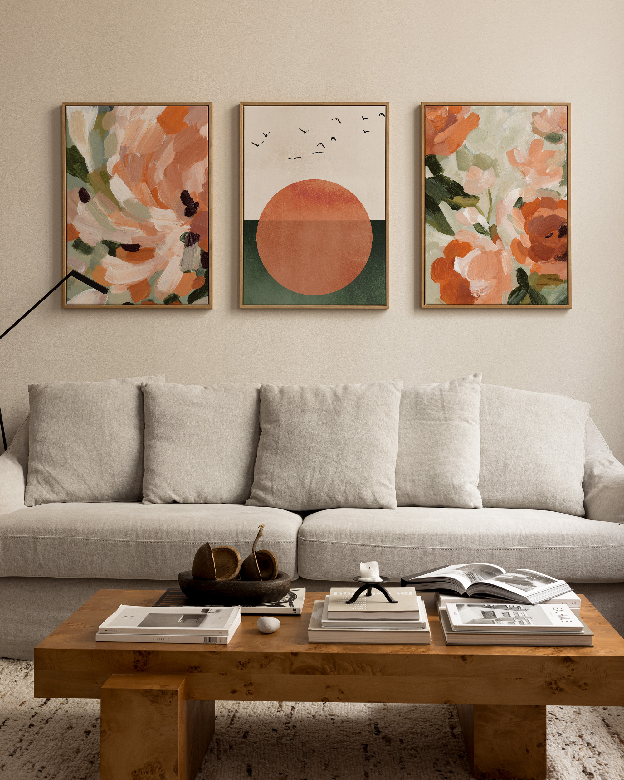 Fra 429 krTre abstrakte lerretsbilder i varme farger som oransje, rosa, grønt og krem. Det midterste lerretsbildet har en stor oransje sirkel med fugler.