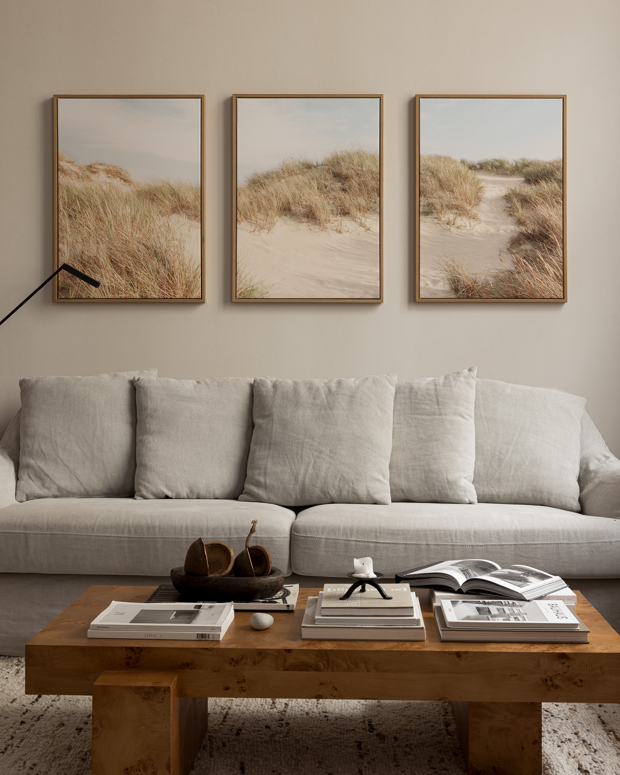 Fra 429 krTre lerretsbilder med sanddyner og gress i myke beige toner. Perfekt veggkunst for å skape en rolig og naturlig bildevegg.