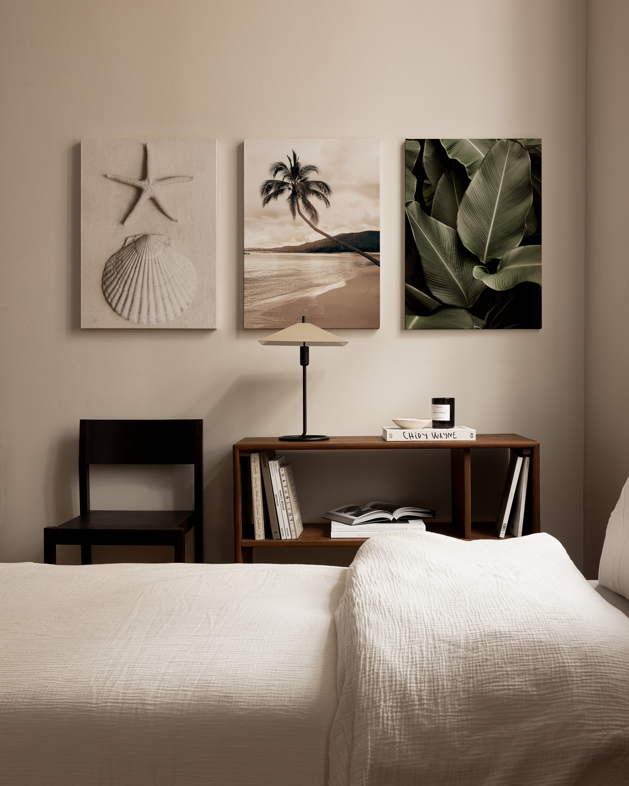 Fra 429 krEt sett med tre lerretsbilder med en sjøstjerne og skjell, et palmetre på en strand, og grønne blader i beroligende grønne og beige toner.