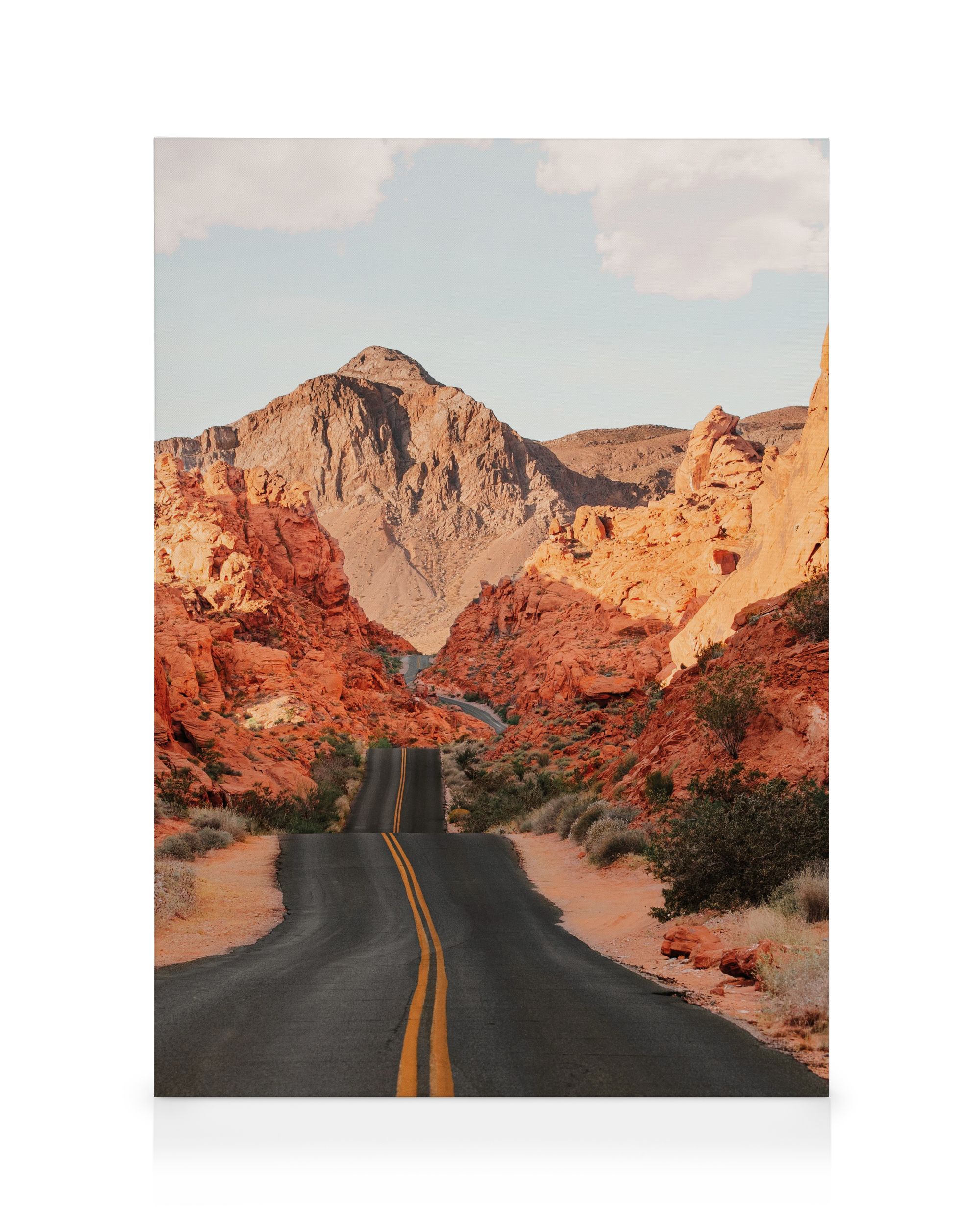 Fra 429 krEn bildevegg med tre lerretsbilder som viser en ørkenvei med røde steiner og fjell i varme oransje og beige toner.