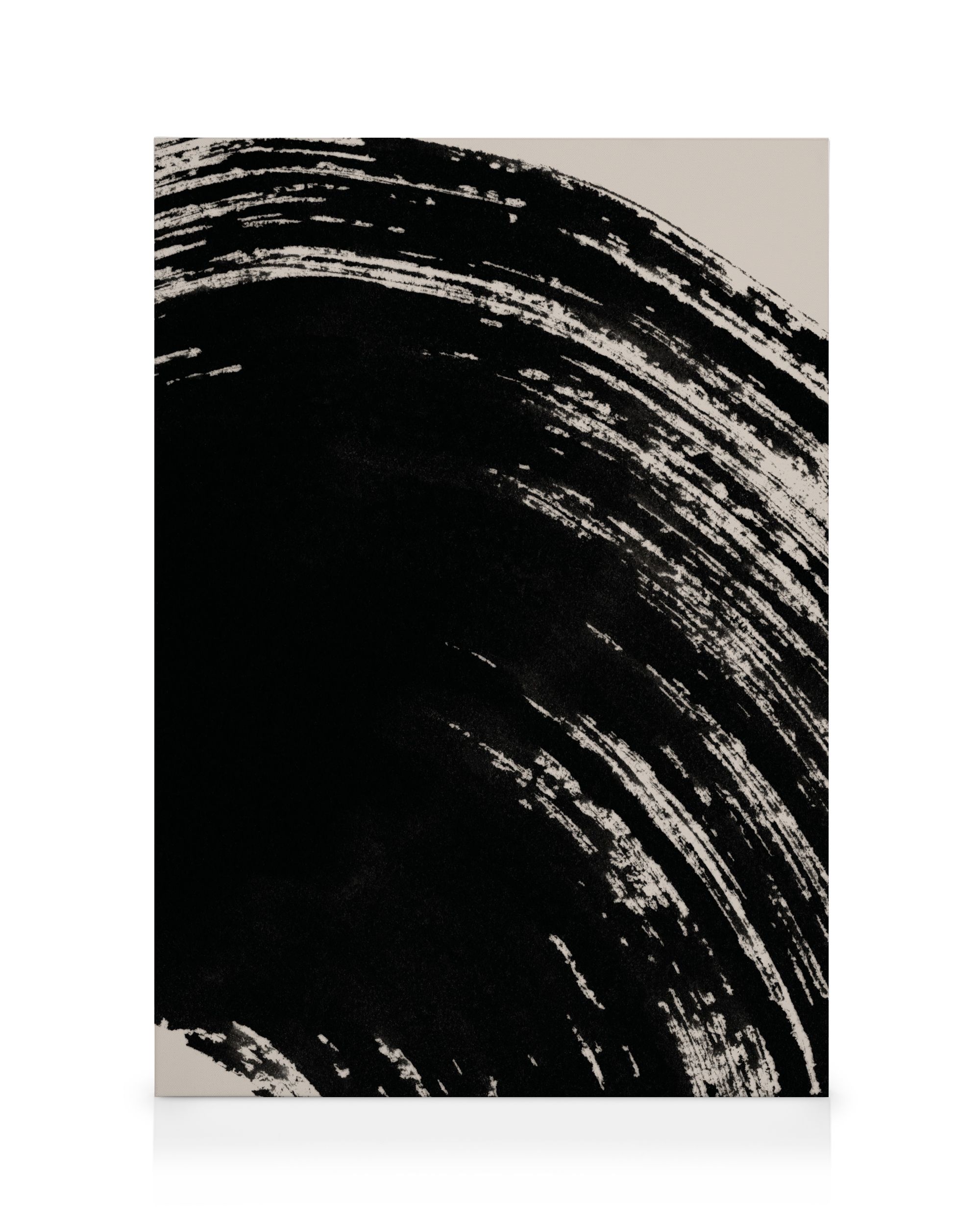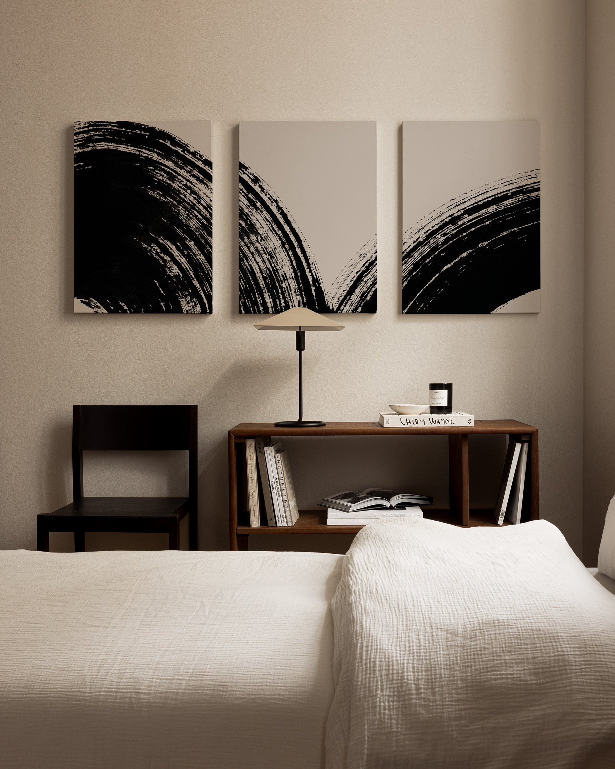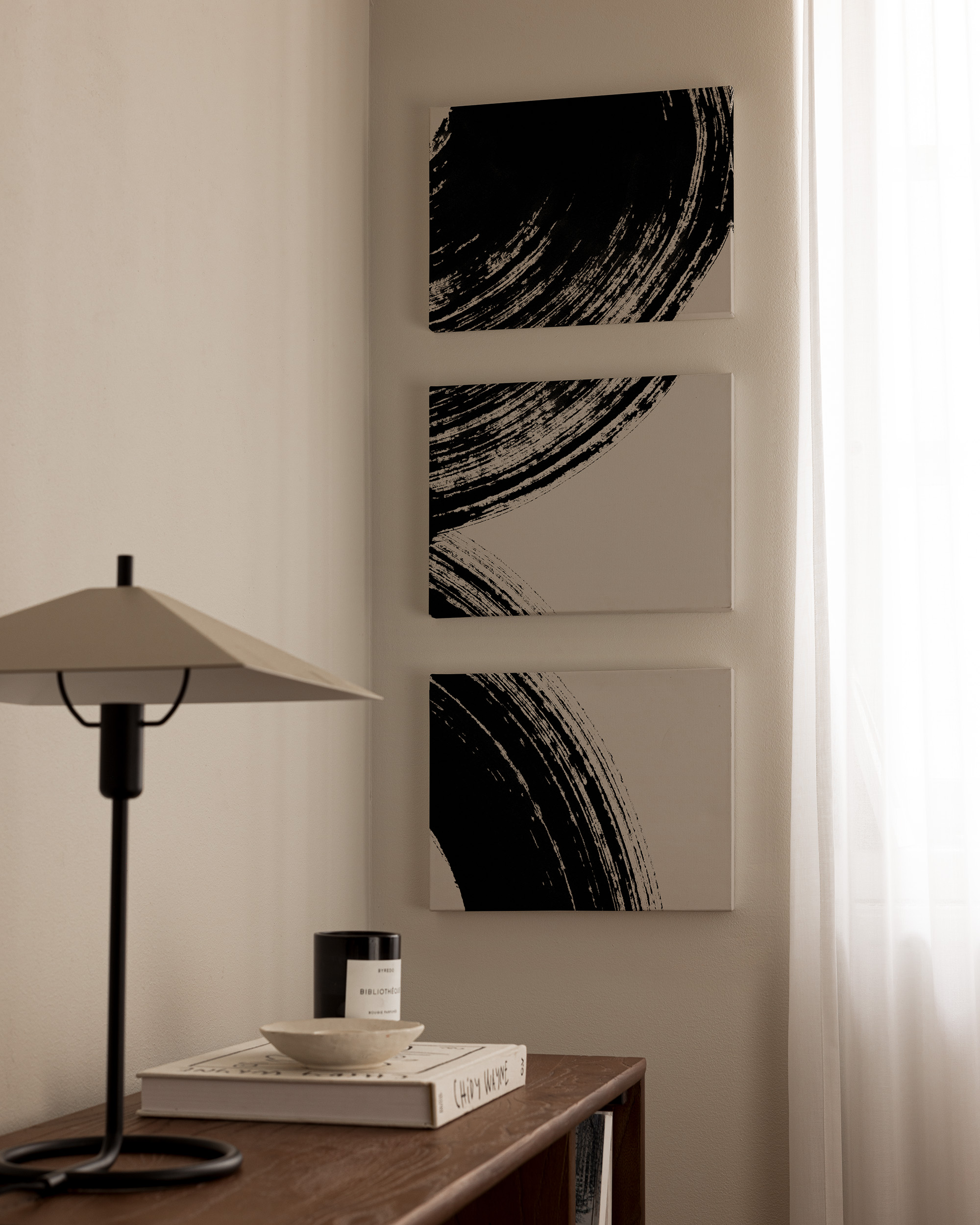 Fra 429 krTre abstrakte lerretsbilder med buede linjer i svart og hvitt på en beige bakgrunn. Perfekt veggkunst til soverommet ditt.
