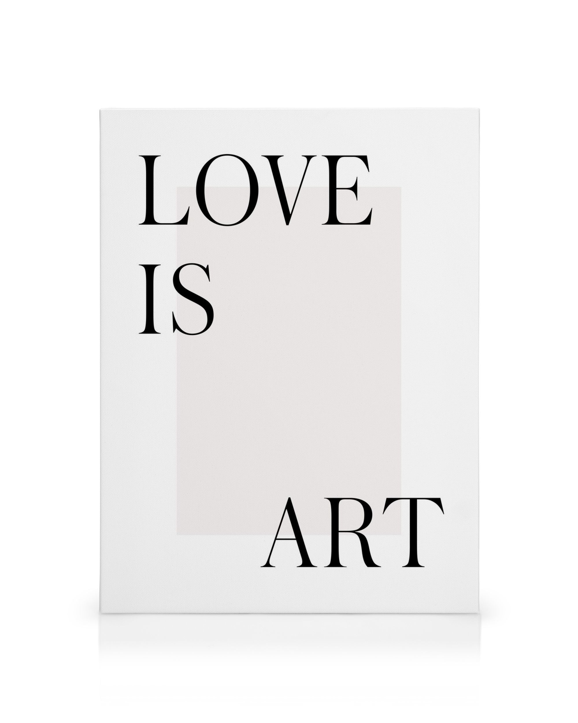 Et stilrent lerretsbilde med hvit bakgrunn og grå firkant. Den svarte teksten "LOVE IS ART" skaper et moderne og minimalistisk uttrykk.