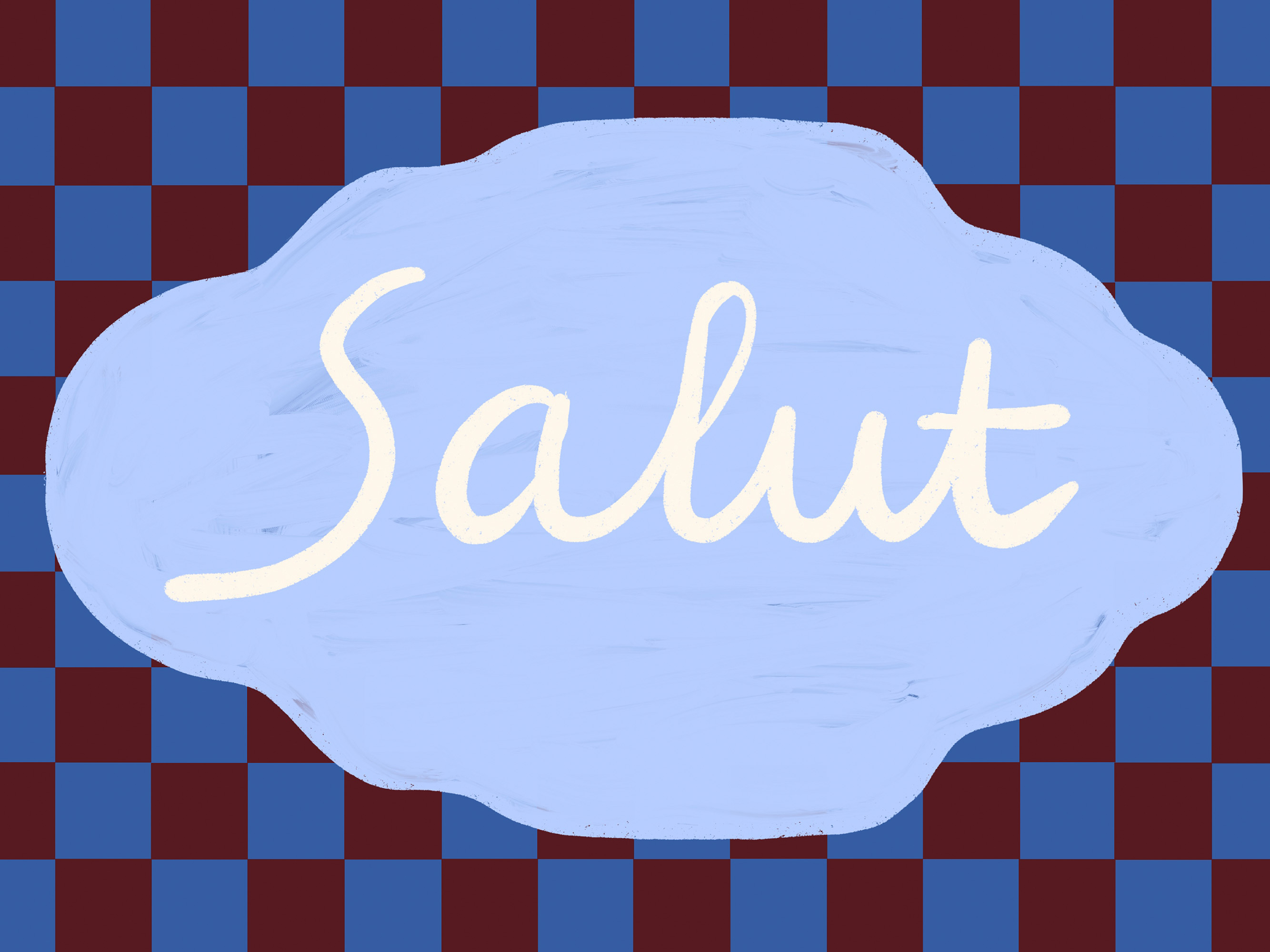 Fra 429 krEn plakat med ordet "Salut" i hvit skråskrift på en lyseblå skyform mot en rutete bakgrunn i rødt og blått.