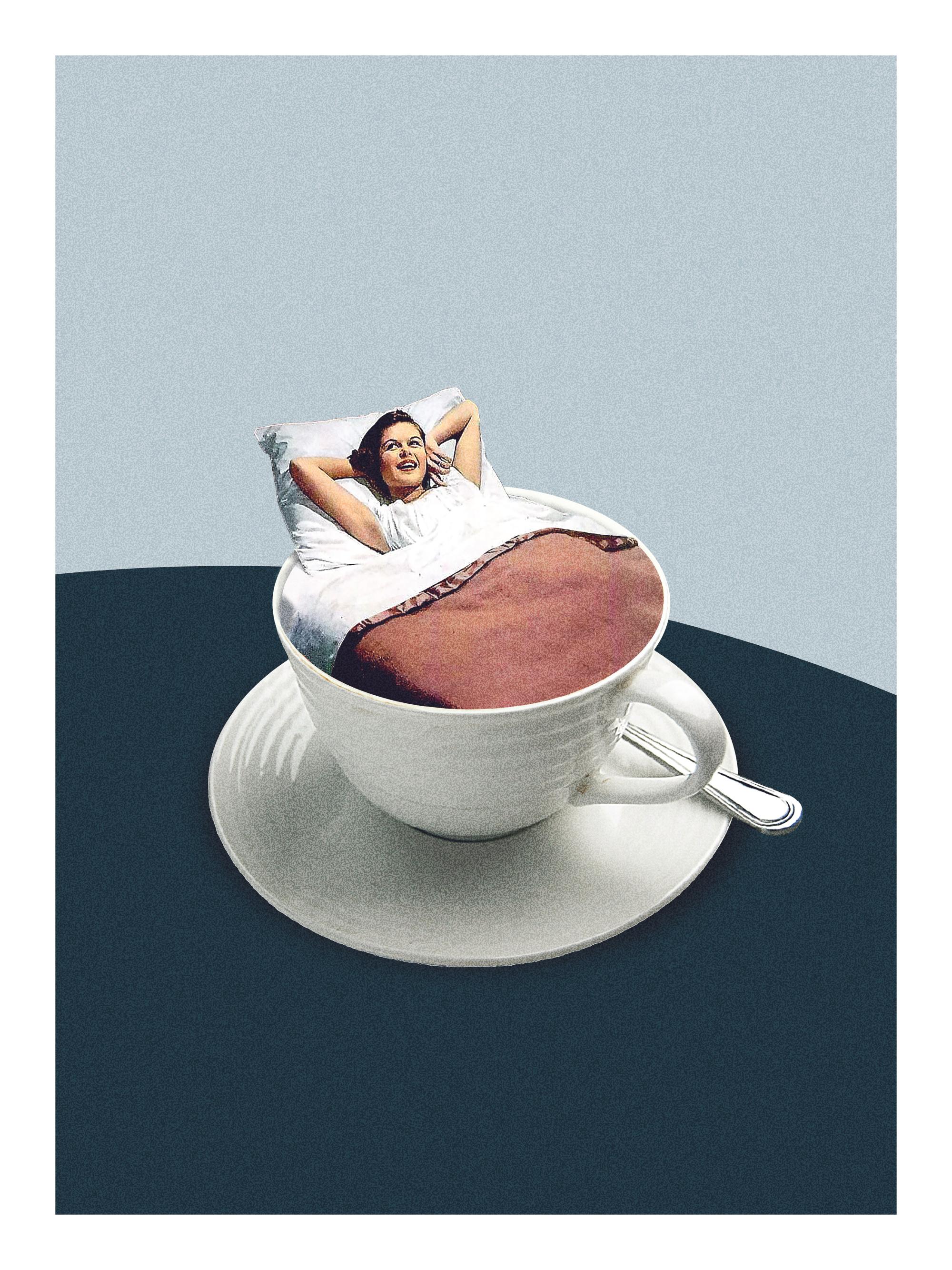 Grafisk fotokunst av en kvinne som ligger på en pute under en dyne i en kaffekopp mot en blå bakgrunn. Gi hjemmet en retro vintage-stil med fotokunst som fremhever denne morsomme og kreative stilen!