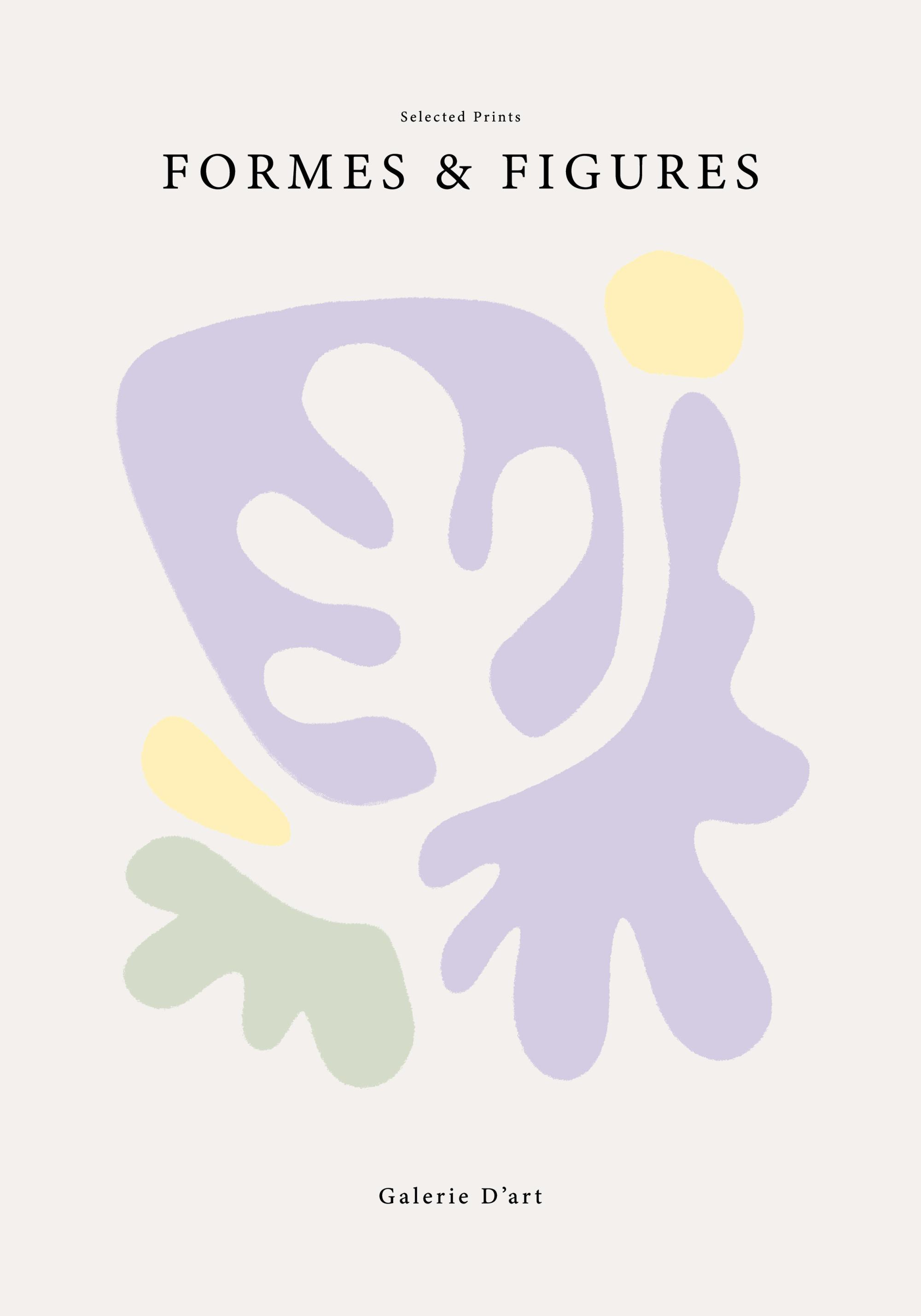 Plakat i lilla, grønn, gul og beige pastellfarger i forskjellige former og figurer med teksten "Selected Prints Formes & Figures" øverst, og teksten "Galerie D'art" nederst. Lag et perfekt par med denne plakaten sammen med "Formes & Figures No1 Poster". Perfekt kunstplakat til stuen eller soverommet for en moderne stemning