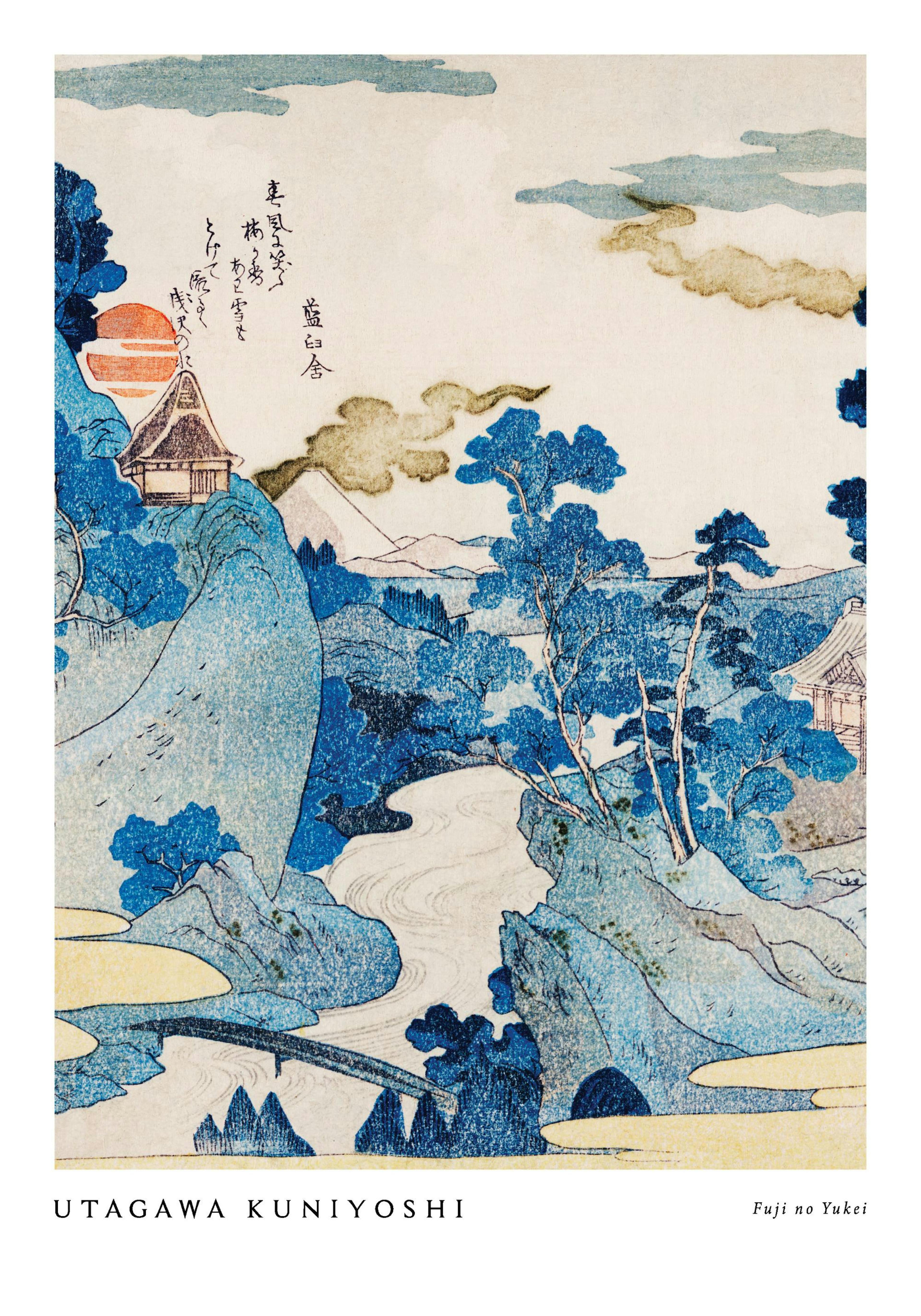 Kunstplakat av et landskap i blått og beige av den berømte kunstneren Utagawa Kuniyoshi. Denne kunstplakaten vil gi en rolig og myk stemning til veggene dine. Kombiner denne plakaten med Ogiya uchi Hanaogi.