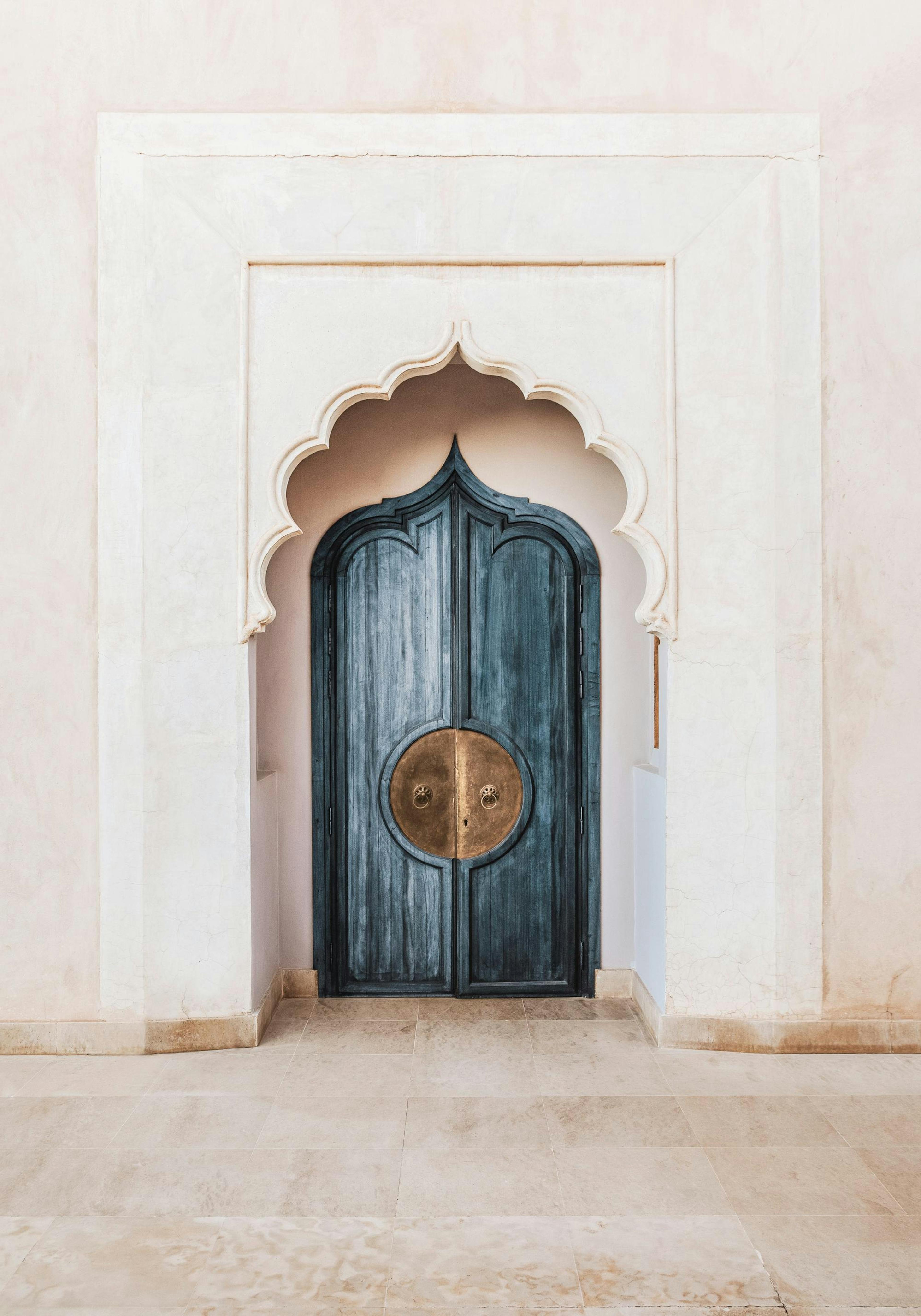 Fotografi av en blå dør med gylne håndtak, med en bue foran. Arkitekturen i Marrakech er svært detaljert. Mange kjenner til den, og vi blir stadig forbløffet over hvor vakker den er! Denne plakaten er en del av Studio Amara, en fotokolleksjon som er laget av Desenio Design Studio i Marrakech.
